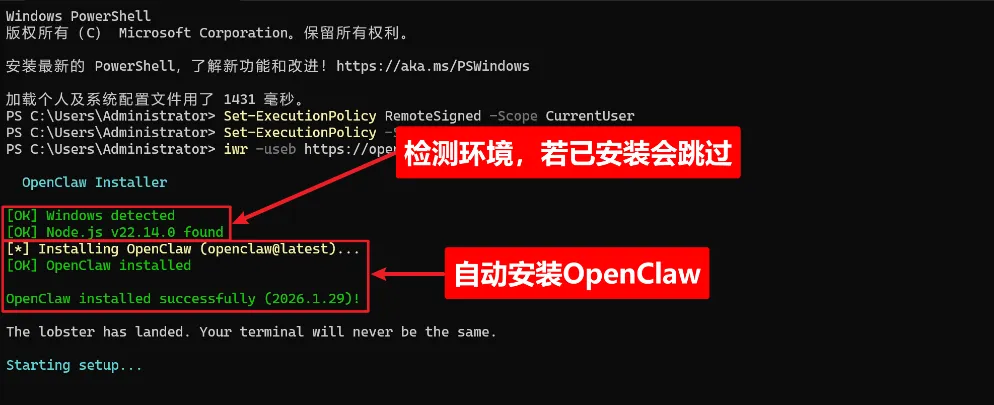 复制以下命令,粘贴到PowerShell窗口中,按Enter执行:iwr-useb https://openclaw.ai/install.ps1 | iex四、初始配置向导