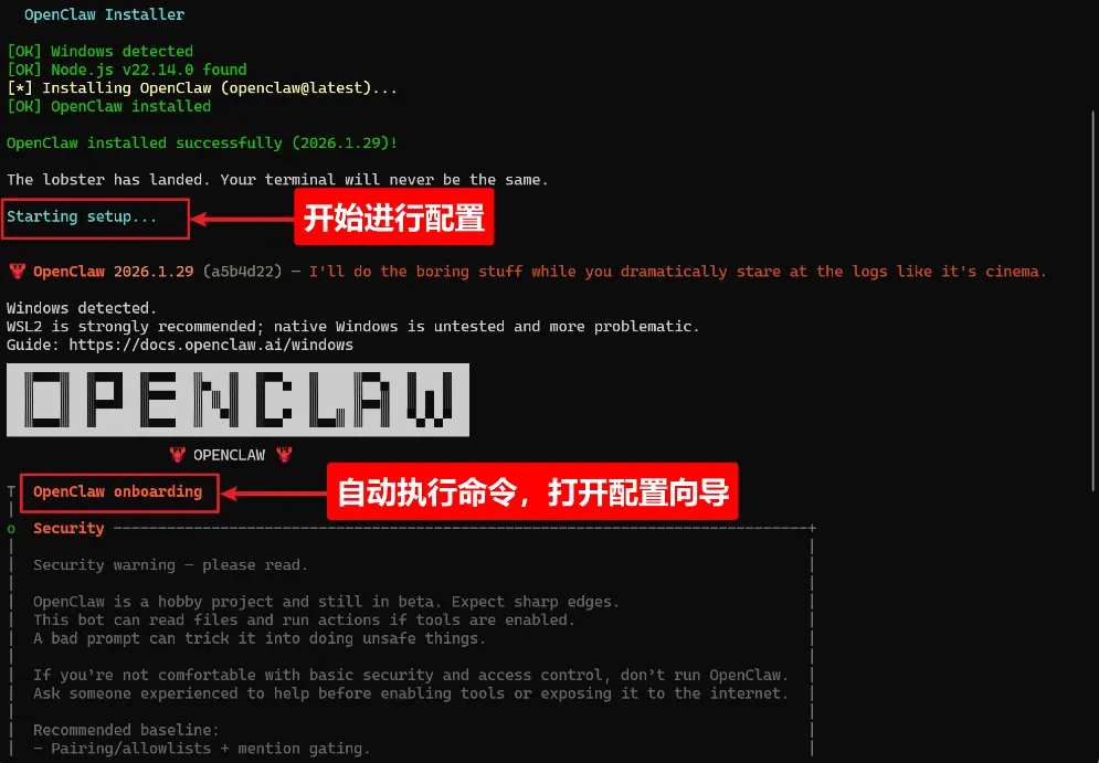 安装完成后,会自动进入配置向导(openclaw onboard)。风险告知
