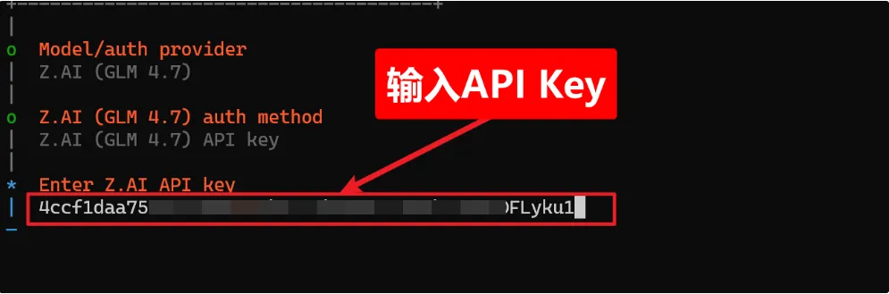 OpenClaw需要连接到大语言模型才能工作。OpenClaw比较费token,国外模型成本高,门槛也高,这里我选择国内的智谱的GLM 4.7如果没有智谱的API Key,点击官方地址自己注册账号获取API key:https://www.bigmodel.cn/glm-coding选择AI模型