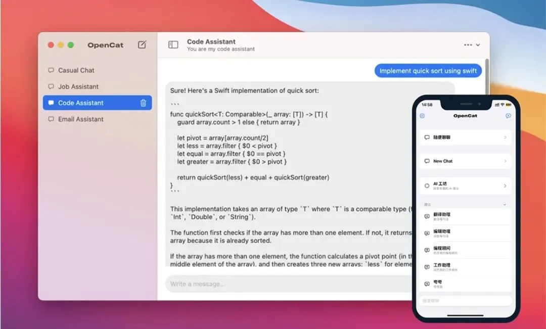 用 OpenCat 对话,无需等待网页加载,随时随地向 ChatGPT 提问。无论写代码还是做美食,都能快速得到答案。想把全能 AI 助手装进口袋?快来试试 OpenCat!