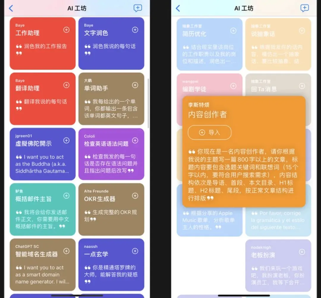 OpenCat 最新版本新增「AI 工坊」,内置精选 Prompt 库,让你一键浏览、套用多种提示语。轻松解锁 ChatGPT 隐藏玩法,快速上手、随心创作。