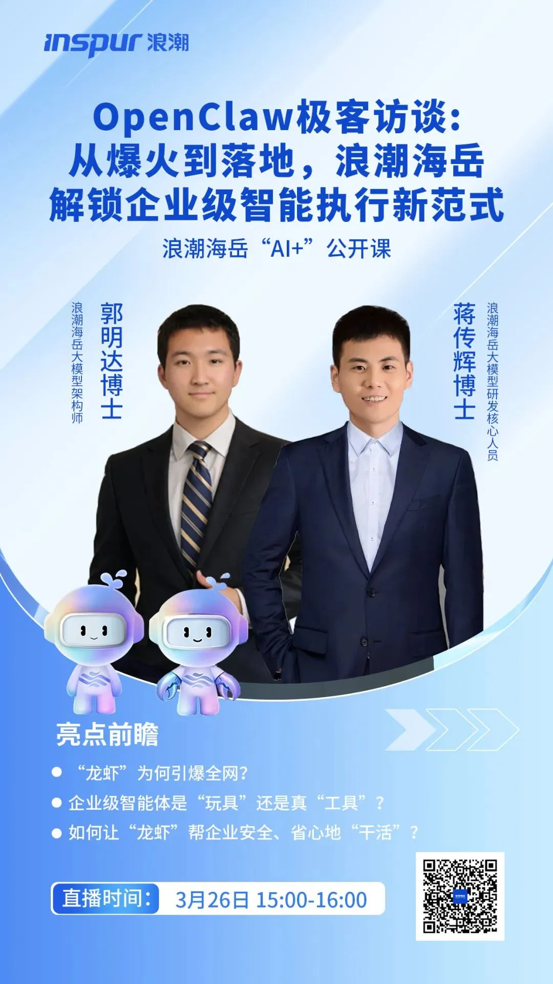 本周三、周四15:00,浪潮集团资深研究员、浪潮海岳穿透式监管方案专家曹景存将带来《数智监管新生态:AI大模型引领穿透式监管的深度变革与实践》分享,浪潮海岳大模型研发核心人员蒋传辉博士、浪潮海岳大模型架构师郭明达博士将带来《OpenClaw极客访谈:从爆火到落地,浪潮海岳解锁企业级智能执行新范式》交流。