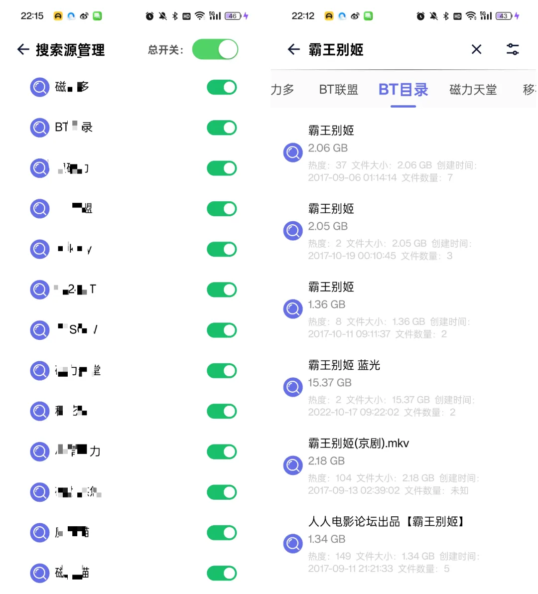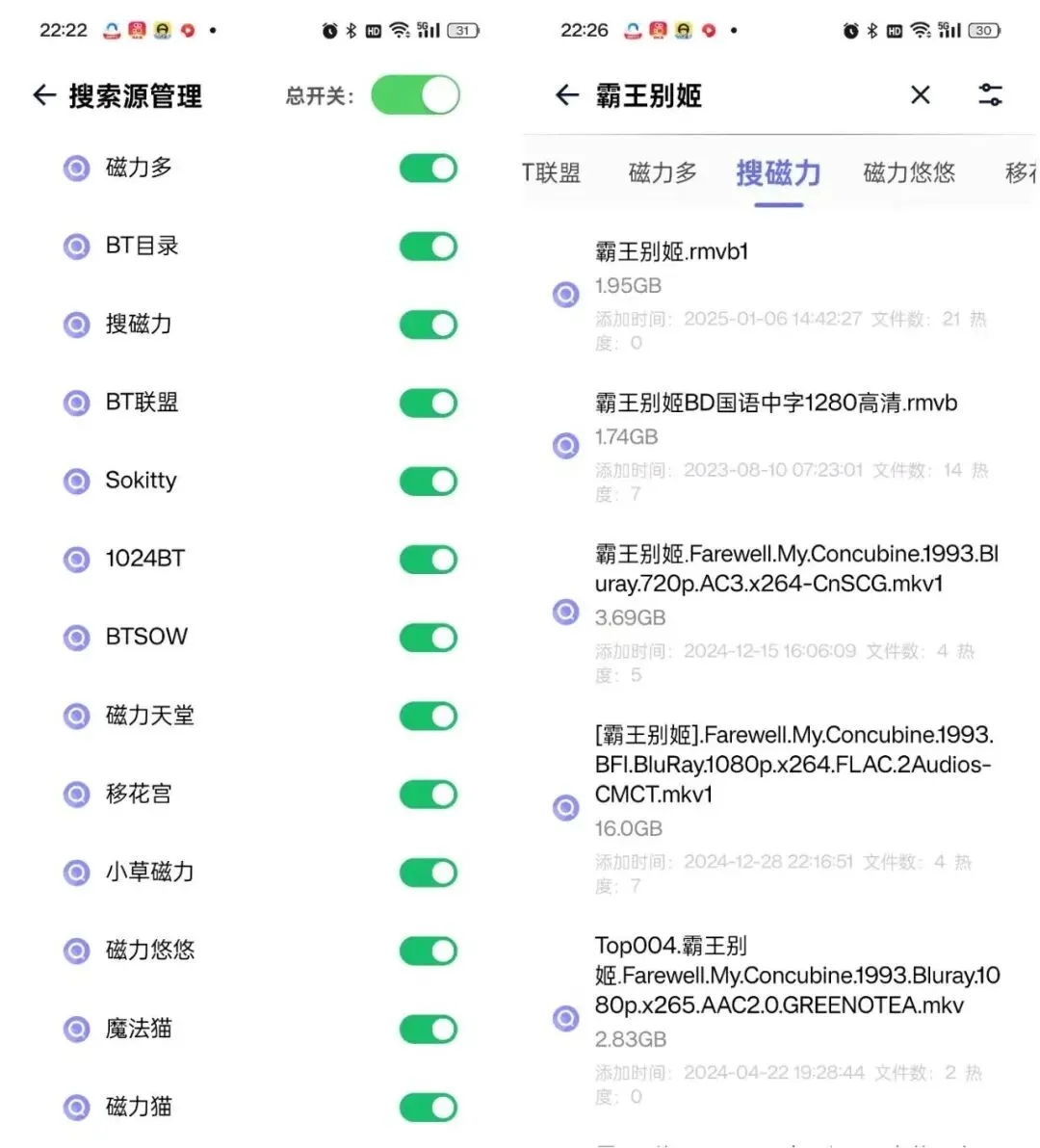 软件非常简洁,仅仅1M左右,打开后是空白的,就一个搜索框。点击右上角的菜单键,可以看到内置的搜索源,一共13个。每个搜索源都相当于一个超级磁力网站。资源的有效率也相当高,质量也非常不错。