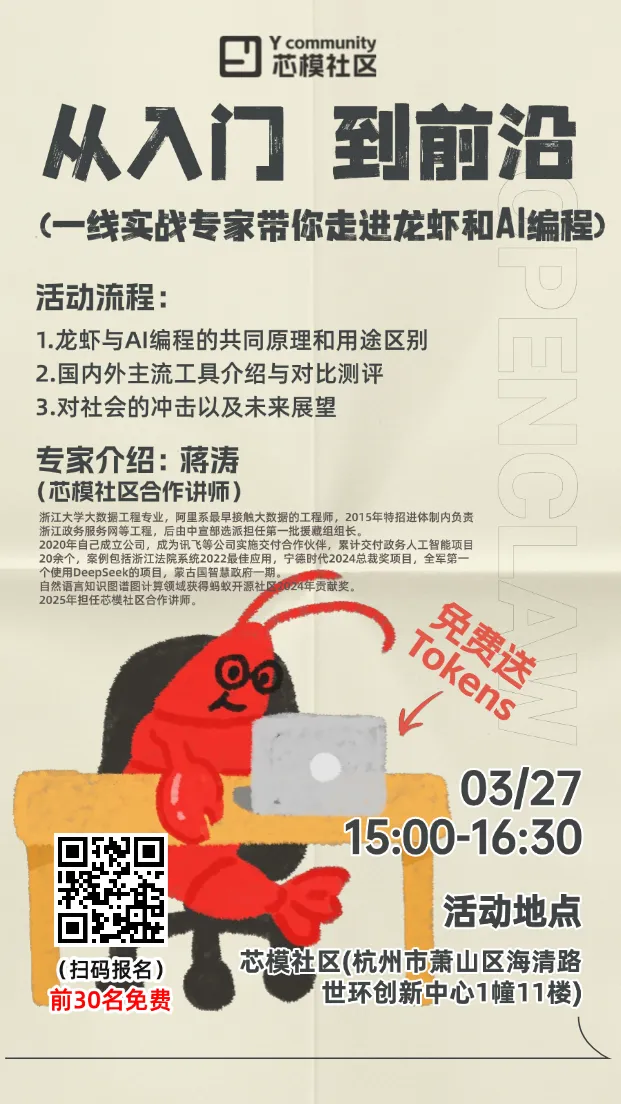 【Openclaw讲座】想搞懂龙虾和AI编程?一线实战专家蒋涛老师带你从入门到前沿!⏰ 3月27日 15:00-16:30📍 杭州市萧山区芯模社区龙虾+AI编程线下分享会来啦!前30名免费参与,即刻扫码锁定席位!