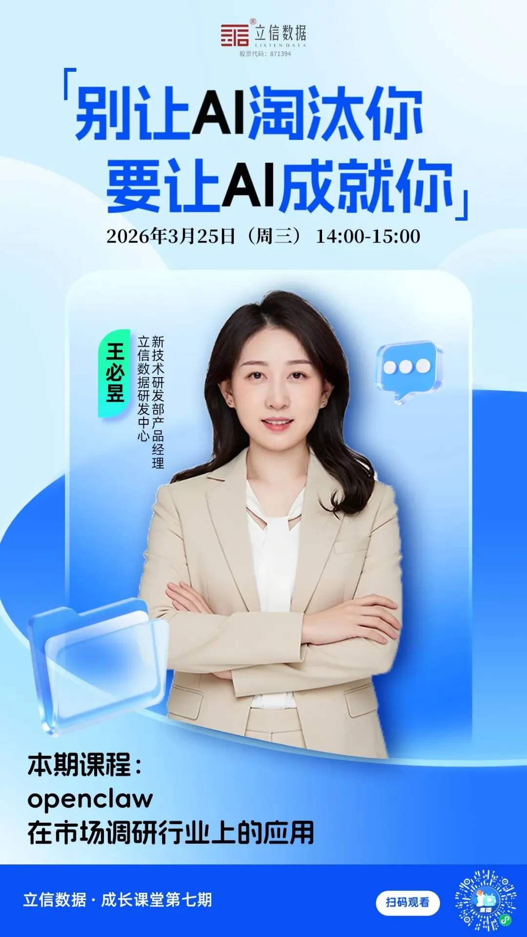 别让犹豫拖慢你的成长脚步,主动拥抱AI,让技术成为你职场进阶的底气。3月25日,立信数据AI成长课堂直播间,我们一起用AI成就更好的自己!