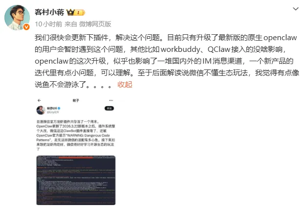 3月24日,也就是事件发生后的第二天,腾讯迅速做出了回应,内部团队开始了紧急修复。下午四点左右,部分用户的微信ClawBot开始陆续恢复功能。