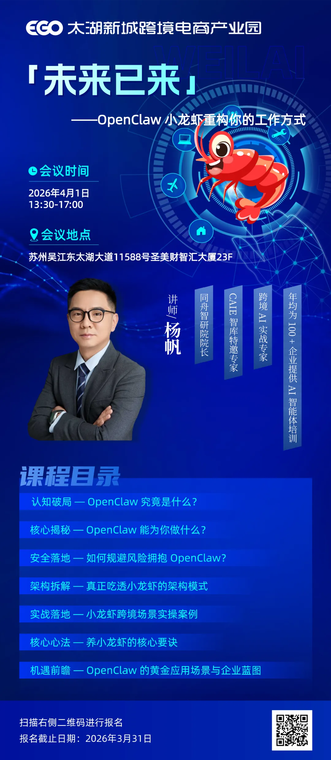 4 月 1 日,相约 EGO 吴江太湖新城跨境电商产业园,与行业大咖共探跨境电商未来。扫描文中海报二维码即可报名,名额有限,先到先得。