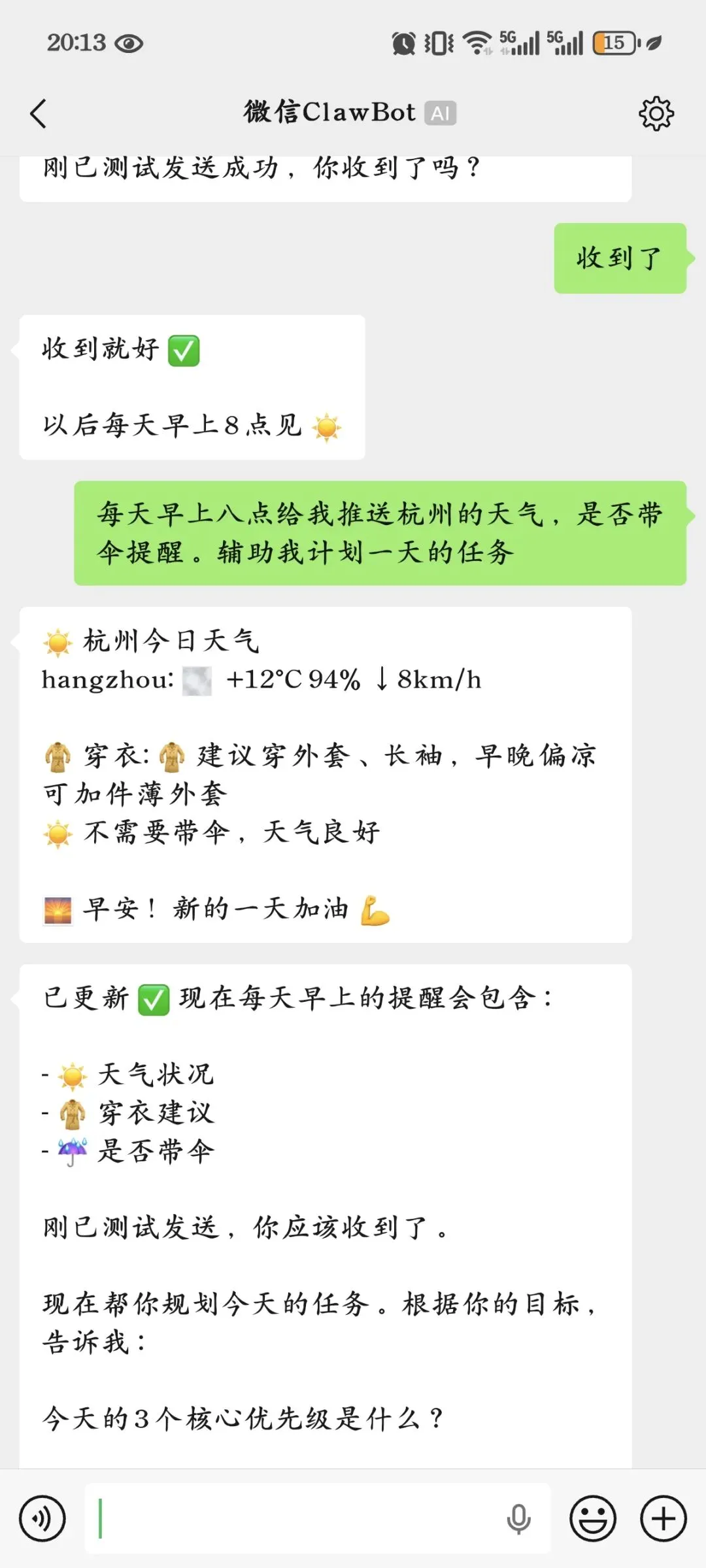 只要它能回,就说明微信入口已经接通了。