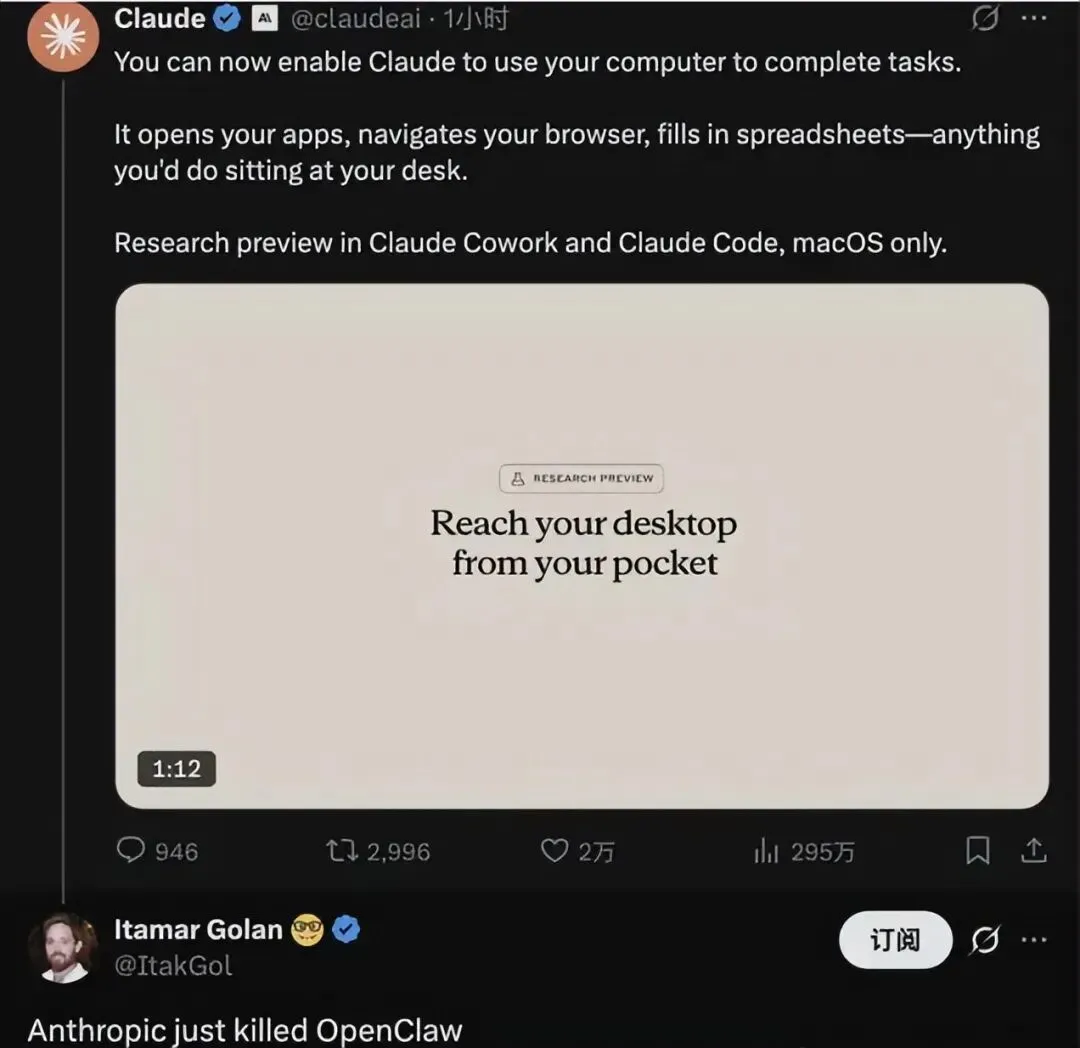 有人说“Anthropic杀死了OpenClaw”,这话说早了。但趋势摆在这:一个需要折腾三小时的DIY工具,和一个打开就能用的官方产品,大多数人选哪个?答案不言自明。