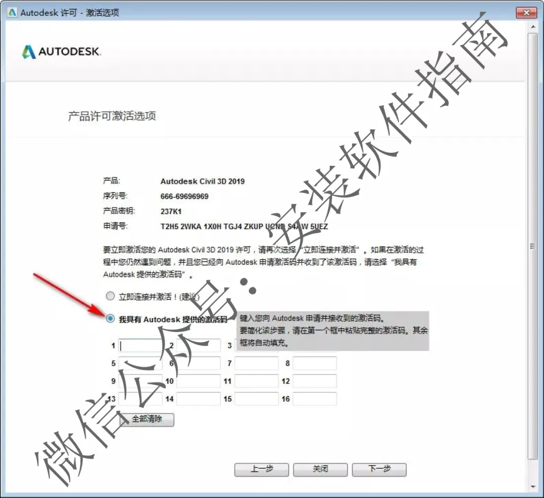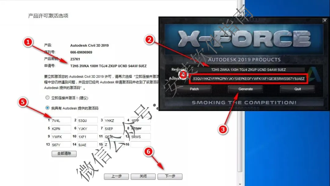 21.复制步骤1旁边的一串申请号,把申请号粘贴到步骤2箭头所指的方框内,点Generate,复制步骤4中生成的激活码,粘贴到步骤5箭头所指位置,点下一步