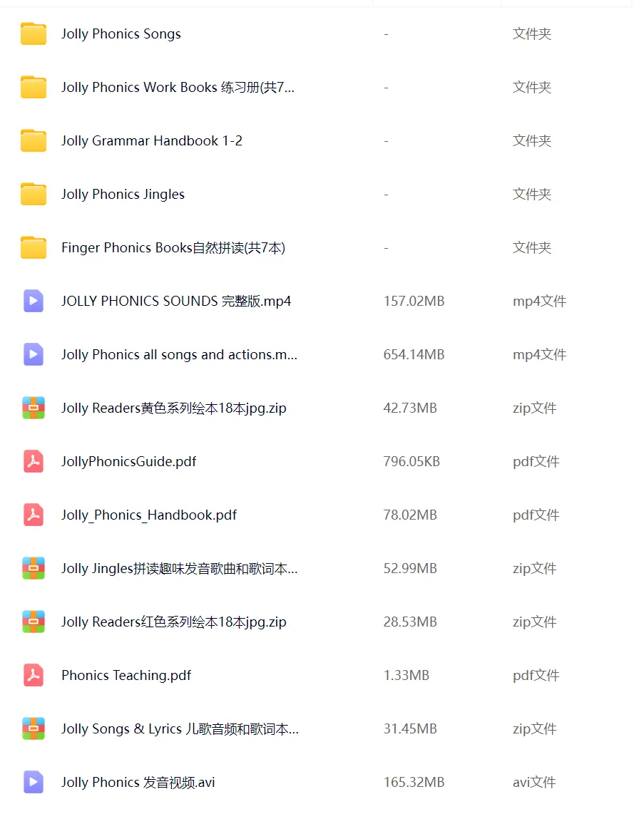 今天分享这套最完整的《Jolly Phonics》版本,包括手指拼音书、语法书、hand book、练习册、歌本、发音视频、教师用书等一大堆!