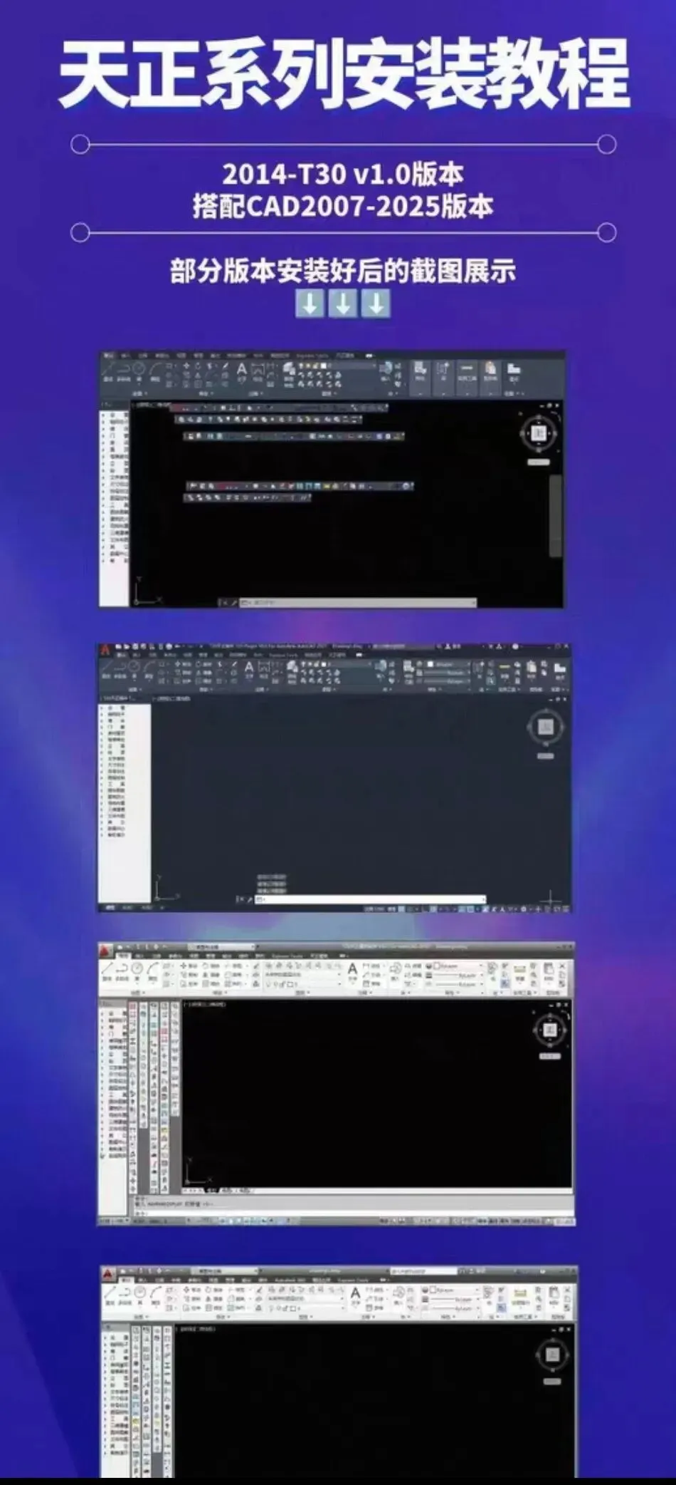 本次整理包含天正建筑、天正暖通、天正给排水、天正电气、天正结构五大专业软件,覆盖2014至T30 v1.0共计10个常用版本,配套齐全的安装包与带字幕的详细安装视频,视频字幕清晰易懂,方便对照步骤一步步完成安装,有效解决安装过程中看不懂、操作出错等问题。其中10.0版本暂未集成天正结构模块,使用时需注意区分。整套资源兼容性良好,适配范围广泛,目前最高可支持AutoCAD 2025版本,能够满足不同版本CAD用户的设计与绘图需求,安装后即可正常使用各专业绘图功能。
