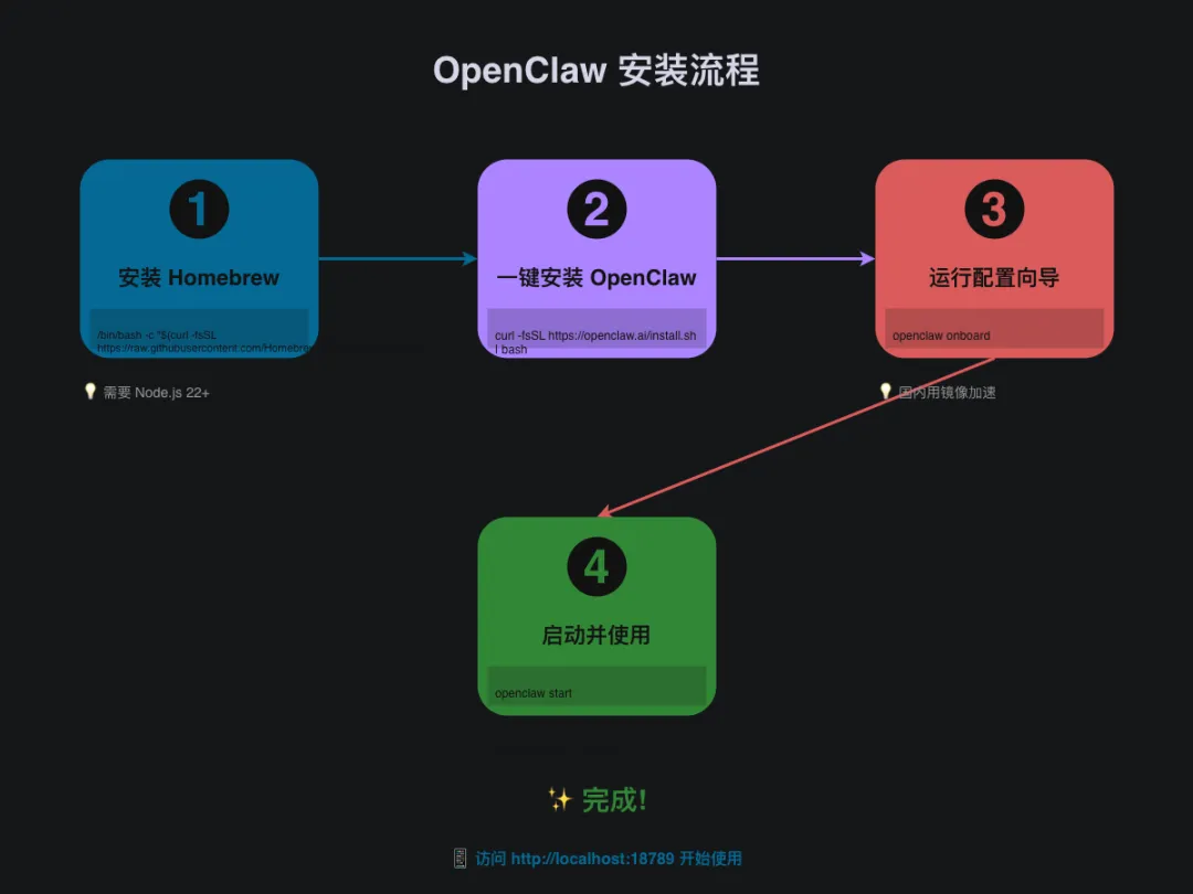 OpenClaw 安装教程:手把手教你打造专属 AI 私人助理01为什么你应该试试 OpenClaw━━━━━━━━━━━━━━━━━━OpenClaw 是一个运行在本地 Mac 上的 AI Agent 框架,来自 @steipete(知名的 iOS 安全研究员)。它的核心能力:• 通过 Telegram Bot 或 Web UI 和它对话• 记住对话上下文和你的个人习惯• 读写本地文件、执行 shell 命令• 支持自定义 Skills,可接入各种服务• 完全本地运行,数据不过任何第三方服务器本质上是把 Claude/GPT 的能力本地化,给你一个可以长期记住上下文、主动执行任务的 AI 助手,而不是每次都要重新说一遍背景。如果你有 Telegram,推荐试试,体验比 Web UI 好很多。02环境准备━━━━━━━━━━━━━━━━━━前置条件:Node.js 22+、Homebrew(没有的话脚本会自动装)、一个 AI API Key。推荐用火山引擎的 API Key,不需要科学上网:火山引擎控制台:console.volcengine.com注册后创建 API Key,模型选 doubao-pro-32k(便宜够用)。03安装 Node.js━━━━━━━━━━━━━━━━━━方式一:Homebrew(最简单)brew install nodenode --version确认看到 v22 或 v24。方式二:nvm(推荐,方便切换版本)curl -o- https://raw.githubusercontent.com/nvm-sh/nvm/v0.40.0/install.sh | bashsource ~/.zshrcnvm install 22nvm use 22国内加速export NODE_MIRROR=https://npmmirror.com/mirrors/node/nvm install 2204安装 OpenClaw━━━━━━━━━━━━━━━━━━一行命令搞定:curl -fsSL https://openclaw.ai/install.sh | bash插入图片:openclaw_steps.png(宽度 900 像素)国内镜像(访问外网慢的时候用)curl -fsSL https://open-claw.org.cn/install-cn.sh | bash安装完成验证openclaw --versionopenclaw doctor看到版本号和 doctor 输出正常就 OK。05初始化配置━━━━━━━━━━━━━━━━━━运行向导:openclaw onboard逐步说明:第一步:确认安全提示⚠️ OpenClaw will have full access to your computer.⚠️ This includes reading and writing files and running commands.⚠️ Please confirm you understand the risks and want to continue.输入 Yes 继续。第二步:选 AI 模型推荐顺序:1. 火山引擎 doubao-pro-32k(国内首选,便宜、稳定)2. Claude 3.7 Sonnet(质量最高,但需要 API 代理或科学上网)3. OpenAI GPT-4o(同上,需要代理)第三步:填 API Key火山引擎填 key 和 base URL(控制台里有);Claude/OpenAI 正常填 key 就行。第四步:连接 Telegram(可选,推荐)填 @BotFather 给你的 Bot Token。没有?Telegram 搜索 BotFather,发送 /newbot,按提示走一遍,复制 Token。第五步:启用系统 Skills(默认全开就行)06启动━━━━━━━━━━━━━━━━━━前台运行(调试用):openclaw start后台运行(日常用):openclaw start --detach访问地址:• Web UI:http://localhost:18789• Telegram:直接给 Bot 发消息插入图片:Web UI 截图(localhost:18789)07目录结构━━━━━━━━━━━━━━━━━━~/.openclaw/ 是所有数据的根目录:~/.openclaw/├── openclaw.json # 全局配置(AI 模型、渠道)├── .env # API Key 等敏感信息├── credentials/ # 各渠道认证信息(自动生成)├── agents/ # 会话数据(自动)└── workspace/ # Agent 的工作目录 ← 重点 ├── AGENTS.md # 系统指令 ├── SOUL.md # 人设 ├── USER.md # 你的个人信息 ├── memory/ # 每日记忆 └── skills/ # 自定义技能重点记住 workspace/ 目录,所有和 Agent 交互的文件都在这里。需要手动改的文件openclaw.json — 模型配置、渠道开关.env — API Keyworkspace/USER.md — 写你的背景,它会更懂你workspace/SOUL.md — 人设,比如让它叫「阿福」openclaw.json 核心结构{ "providers": { "volcengine": { "apiKey": "xxx", "baseURL": "https://ark.cn-beijing.volcengineapi.com" } }, "channels": { "telegram": { "enabled": true, "botToken": "xxx" } }}备份注意备份这三项就够了:• ~/.openclaw/workspace/• ~/.openclaw/openclaw.json• ~/.openclaw/.envagents/ 和 credentials/ 都是自动生成的,不需要备份。08常见问题━━━━━━━━━━━━━━━━━━Q:command not found: openclawsource ~/.zshrcQ:Node.js 版本报错brew upgrade nodeQ:Telegram Bot 没反应1. 检查 openclaw onboard 里填的 Token 对不对2. 确认 Bot 已经收到 /start 消息3. 确认防火墙没有封 18789 端口Q:火山引擎连不上检查 baseURL 是否填对,应该是:https://ark.cn-beijing.volcengineapi.comQ:想换模型直接改 openclaw.json 里的 providers 部分,然后重启:openclaw start --detach09个人化配置━━━━━━━━━━━━━━━━━━让它记住你是谁编辑 workspace/USER.md,写入你的职业背景、工作习惯、常用术语。Agent 会结合这些信息来回答你。比如:我是一个后端工程师,主要用 Go 和 Python。喜欢简洁直接的回复,不要废话。如果有代码问题,给出完整可运行的示例。调人设编辑 workspace/SOUL.md,可以设置名字、语气风格、回复习惯。接更多服务OpenClaw 支持 Skills 扩展,常见的有:• 日历:Google Calendar、Apple Calendar• 邮件:Gmail、企业邮箱• 笔记:Obsidian、Notion• 代码:GitHub PR Review社区 Skills 列表见 GitHub 仓库。最后━━━━━━━━━━━━━━━━━━用了一段时间下来,OpenClaw 最实用的两个场景:1. Telegram Bot 模式:手机上随时丢给它一段代码让它 review,或者让它帮忙写个脚本,比开浏览器快很多。2. 本地文件处理:让它读一个项目目录,理解代码结构,然后问它关于这个项目的技术问题,比每次粘贴上下文给 ChatGPT 方便。后台回复「openclaw」获取官方文档和 GitHub 链接。有问题评论区见。觉得有用,点个赞。