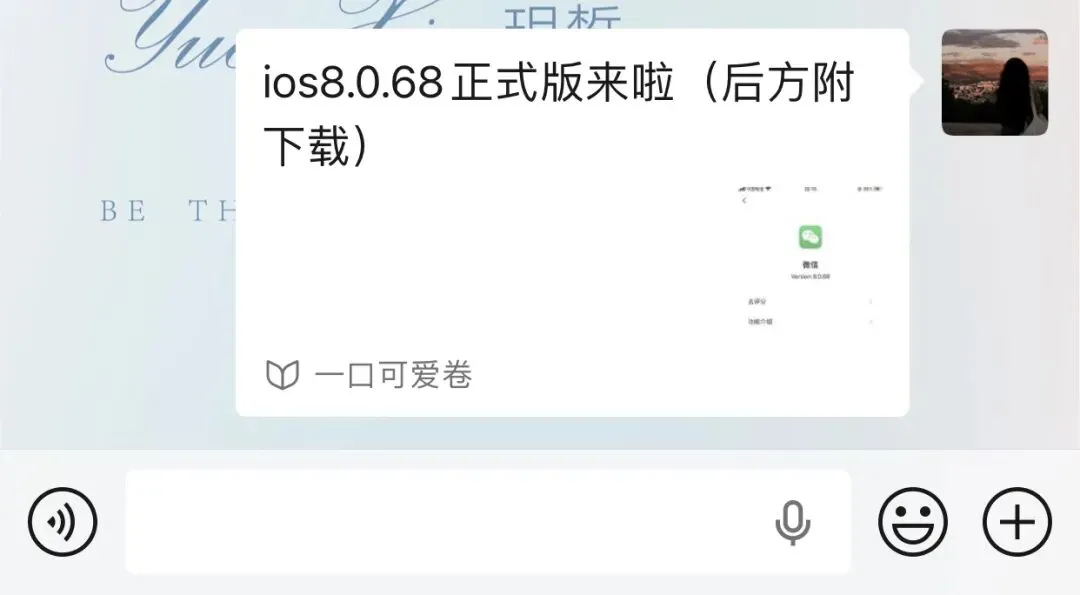 ios微信8.0.70来啦~(后方附下载)1.视频通话新增锁定按钮现在通话接通之后就可以点击锁定屏幕 需要解锁之后才能挂断电话☎️2.订阅号优化这次更新订阅号左下角的头像进行优化了3.语音发送界面优化在本次更新中长按小话筒可以直接说话并发送4.翻译优化现在语音说话转文字 可以翻译多国语言了更加方便快捷了5.插件优化现在点击设置~插件 就可以看到 安卓手机同样有这个功能大家如有发现新功能可以在评论区下方留言!如何获取ios微信8.0.70正式版A:怎么获取ios微信8.0.70正式版B:在一口可爱卷后台回复【微信】即可获取