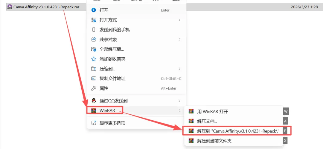 1.鼠标右击【Canva.Affinity.v3.1.0.4231-Reрack】,选择【解压到Canva.Affinity.v3.1.0.4231-Reрack】。