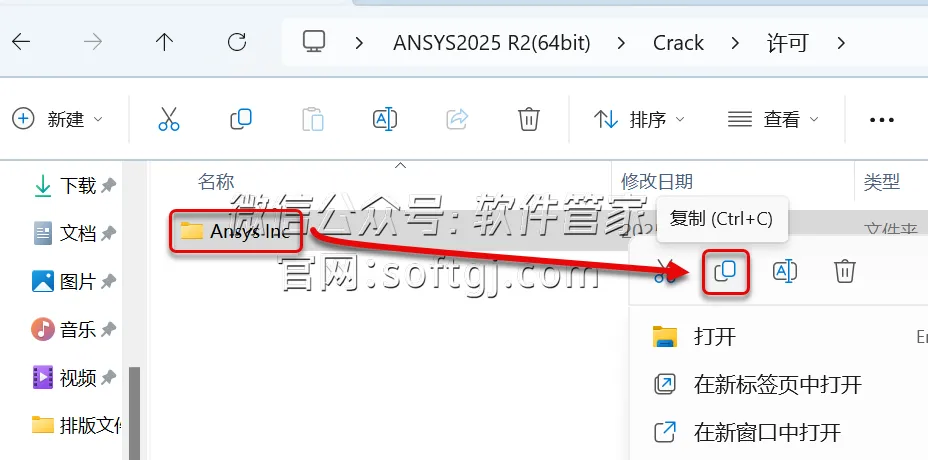 14.打开安装包解压后的【ANSYS2025 R2(64bit)】文件夹,依次打开【Crack\许可】文件夹,鼠标右击【ANSYS Inc】选择【复制】。