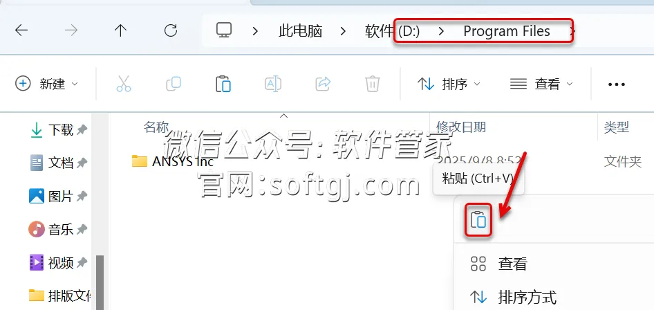 76.打开软件安装路径:【D:\Program Files】(如您在步骤30修改为其他位置,选择对应位置打开),鼠标右击空白处选择【粘贴】。