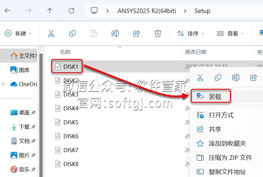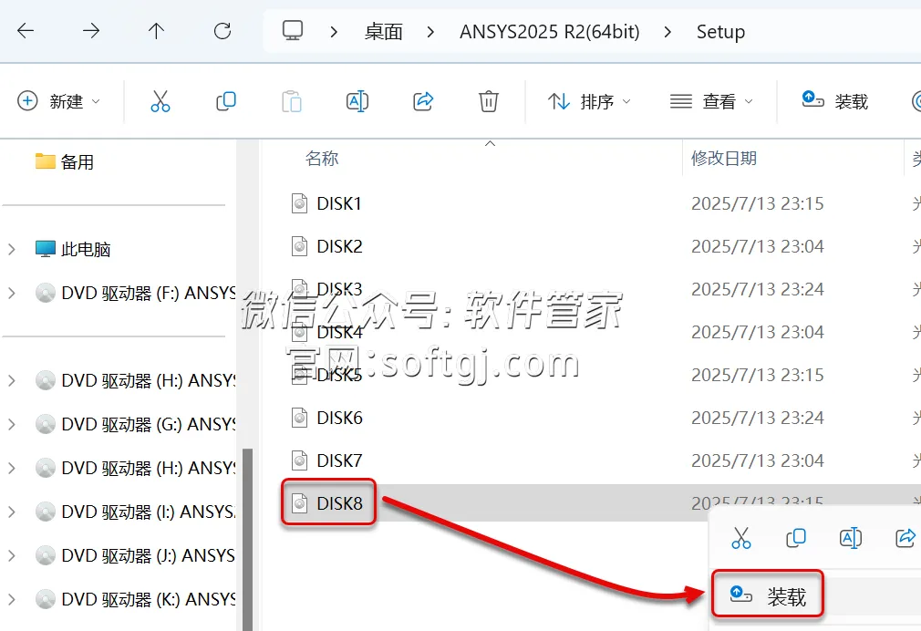 26.打开安装包解压后的【ANSYS2025 R2(64bit)】文件夹中【Setup】文件夹,鼠标右击【DISK1】选择【装载】。