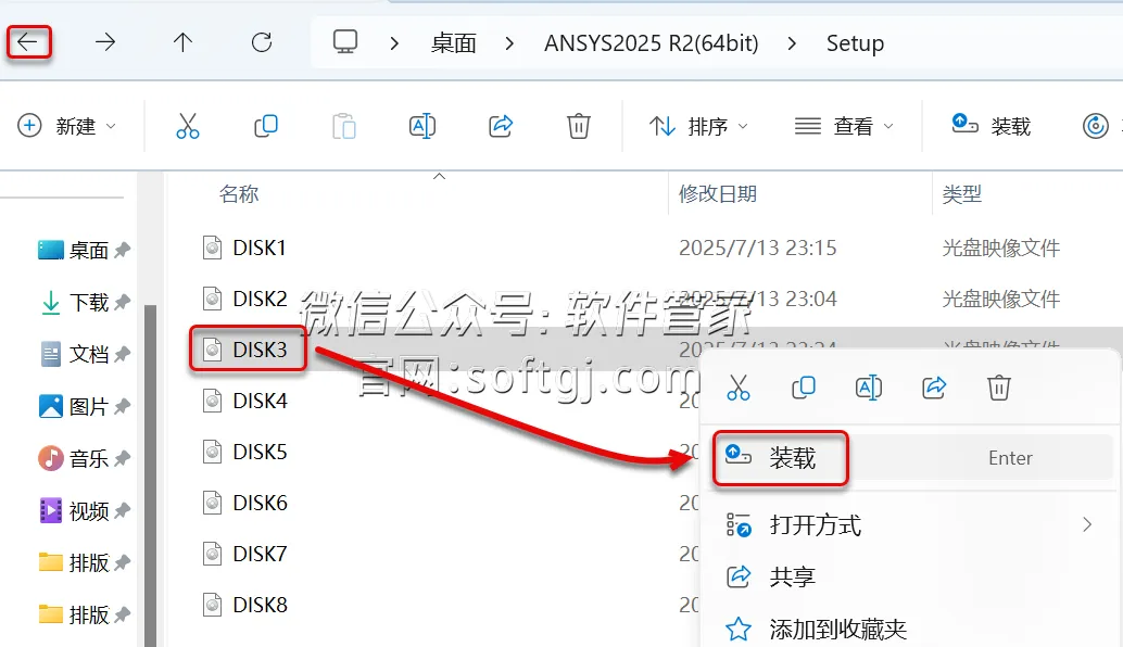 45.打开安装包解压后的【ANSYS2025 R2(64bit)】文件夹中【Setup】文件夹,鼠标右击【DISK3】选择【装载】,点击“向左”箭头。