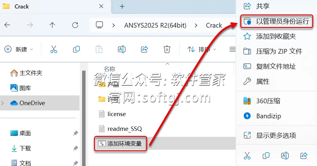 1.解压安装包:①鼠标右击【ANSYS2025 R2(64bit)】压缩包②选择电脑上安装的解压软件(如:360压缩)③点击【解压到ANSYS2025 R2(64bit)】。