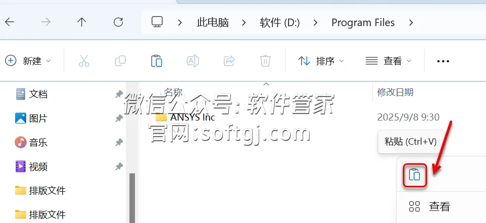 15.打开许可安装路径【D:\Program Files】(如您在步骤8修改为其他位置,选择对应位置打开),鼠标右击空白处选择【粘贴】。