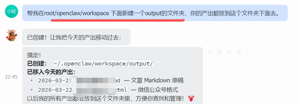 在/.openclaw/workspace下新建output,后面每个技能的产出物都放在output文件夹下的技能文件夹下,每个文件都带上生成日期。