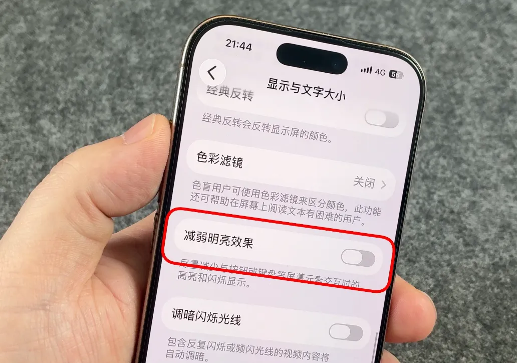 在设置-辅助功能-显示与文字大小项目下,新增了一个名为「减弱明亮效果的功能」,开启该功能后,部分按钮的液态效果会淡化很多。