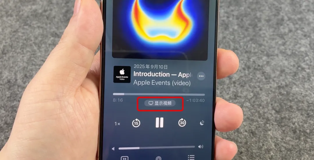 现在我们在听播客时,如果节目有视频版本,你会在这里看到一个「显示视频」的按钮,点击它即可无缝切换到视频模式,再点击一次,即可切回音频播放模式。