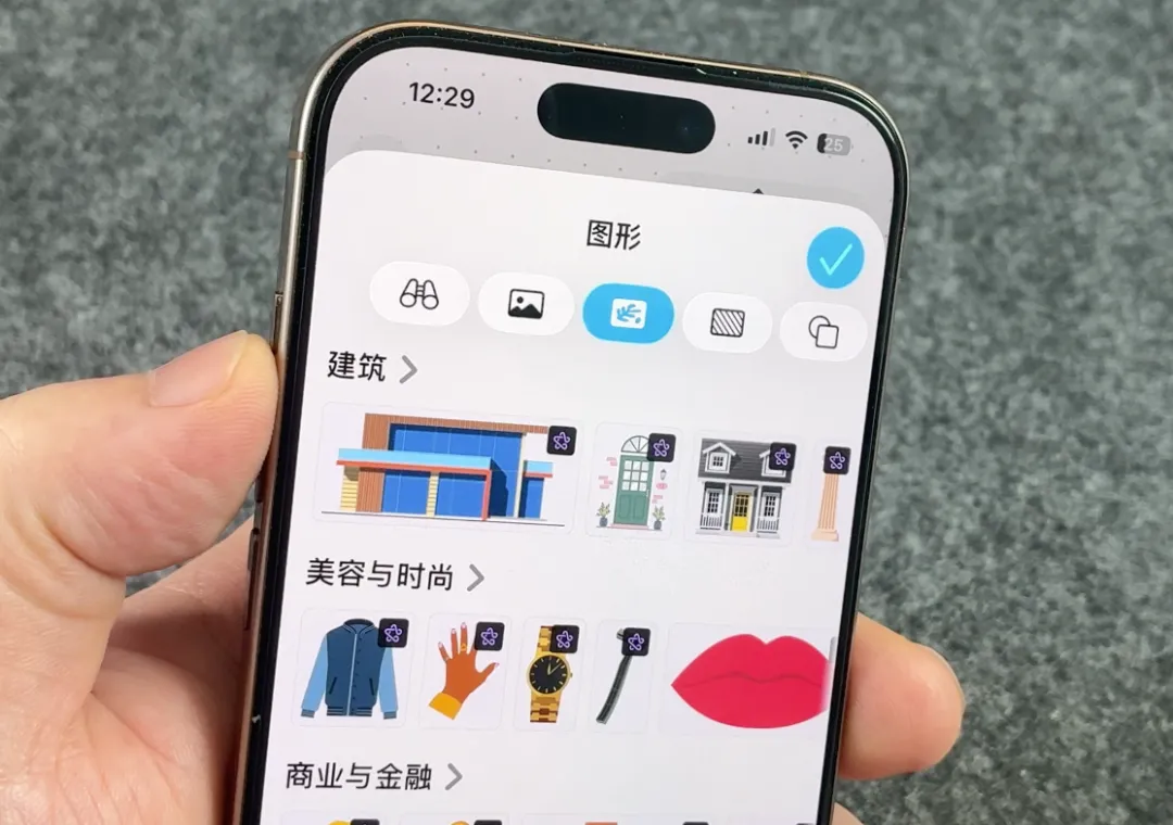 除了基础的几何图标,iOS 26.4还新增了探索、照片、图形,以及背景四个项目,这四个项目中的部分素材是需要付费才能使用的。