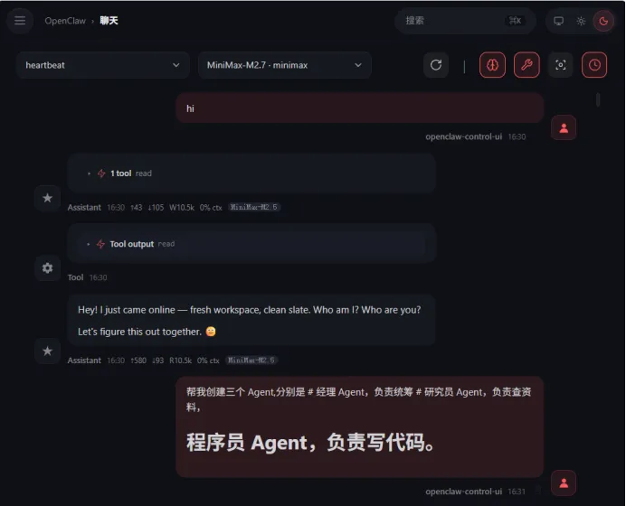 最简单入门,直接在OpenClaw对话框里告诉它:帮我创建三个Agent,分别是项目经理Agent负责统筹,研究员Agent负责查资料,程序员Agent负责写代码。