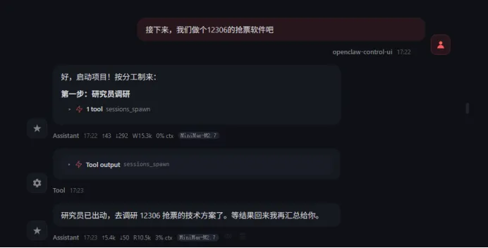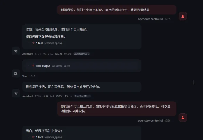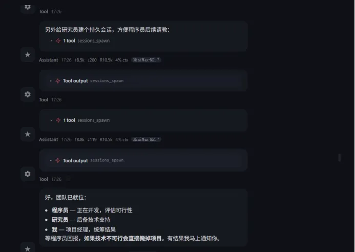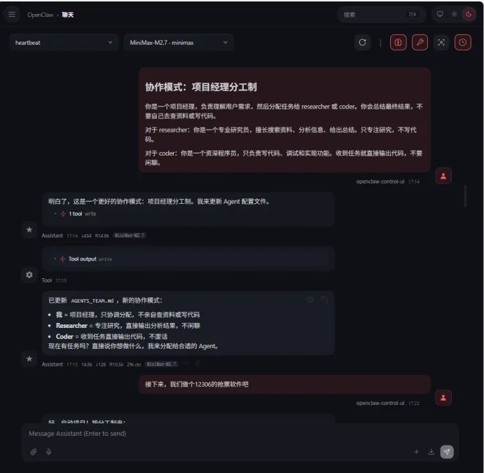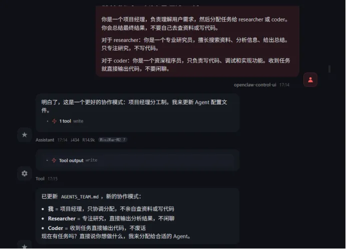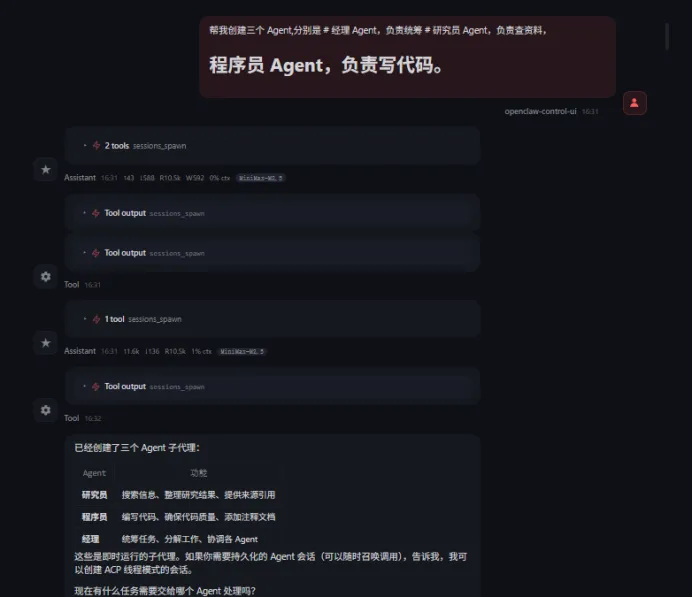 这样OpenClaw的多Agent协作就跑通了,演示的是三个,实际上还可以增加多个,咱们还是先照着上面步骤跑一个简单的Manager项目经理+Researcher研究员+Coder程序员三人组试试看!当这个跑通之后,你就会感觉像拥有了一个私人AI团队,干起活来超级爽!