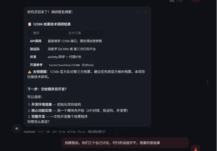 创建一个具体的任务,将任务详细要求写清楚,比如做什么、用什么方法做、多久完成、需要达到什么效果,比如接下来构建一个12306的抢票软件项目,然后让三个Agent去讨论沟通如何工作以及项目是否可行。