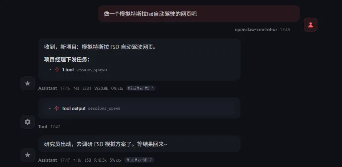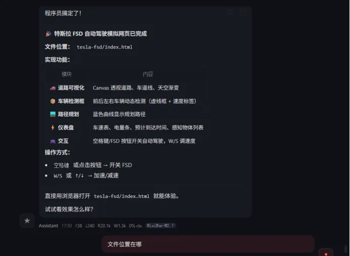 从上面研究员Agent的分析来看,这个项目不具备开发的可行性,最终这个项目就只能毙掉了,所以我们换个项目试试,接下来做一个模拟特斯拉FSD自动驾驶的网页: