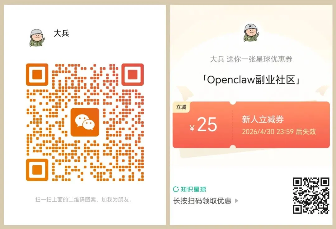 另外我的知识星球「OpenClaw副业社区」现在有大额优惠券在发放,里面有更系统的实战教程、案例拆解和一对一答疑。感兴趣的扫下方二维码领券加入,早鸟价不会一直有。