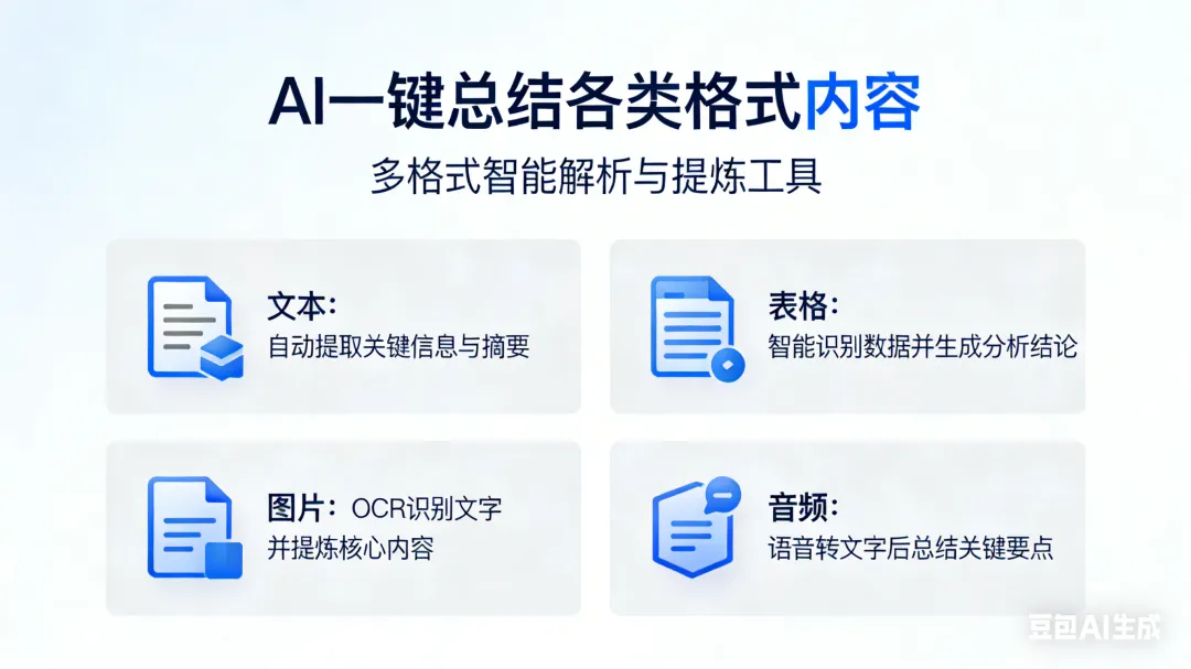 支持PDF、Word、网页、音频、视频全格式内容,一键提炼核心要点、精简长文。