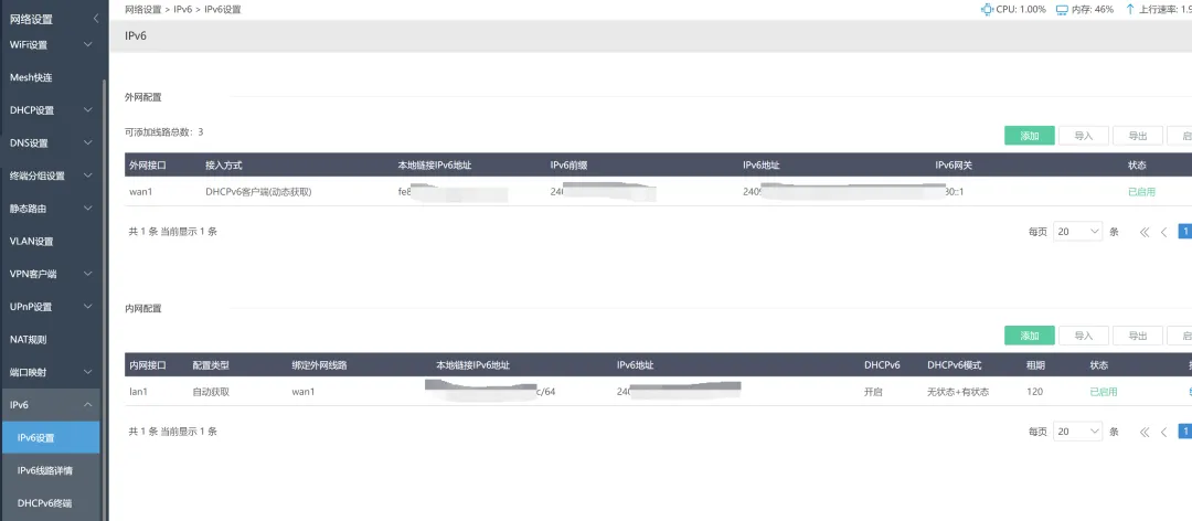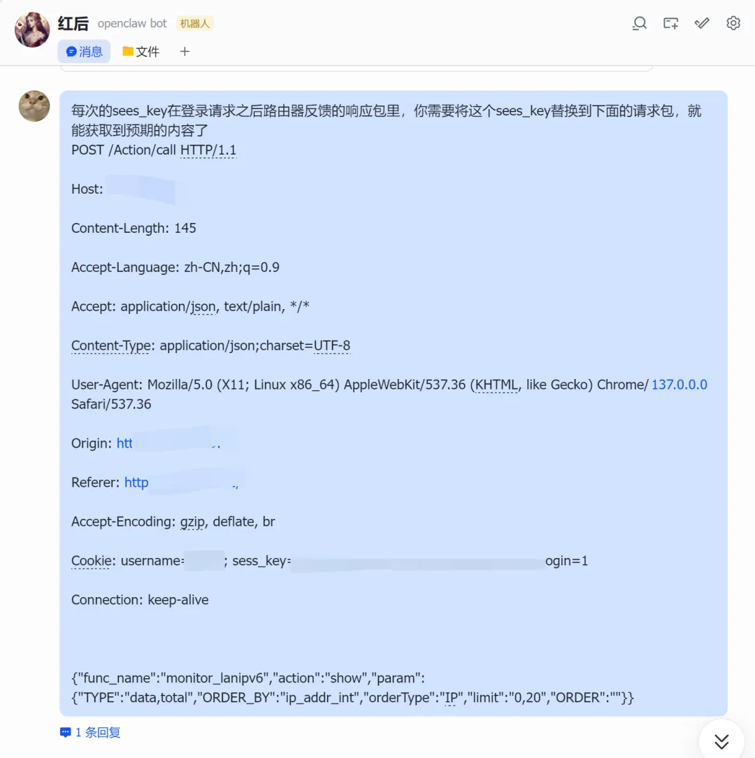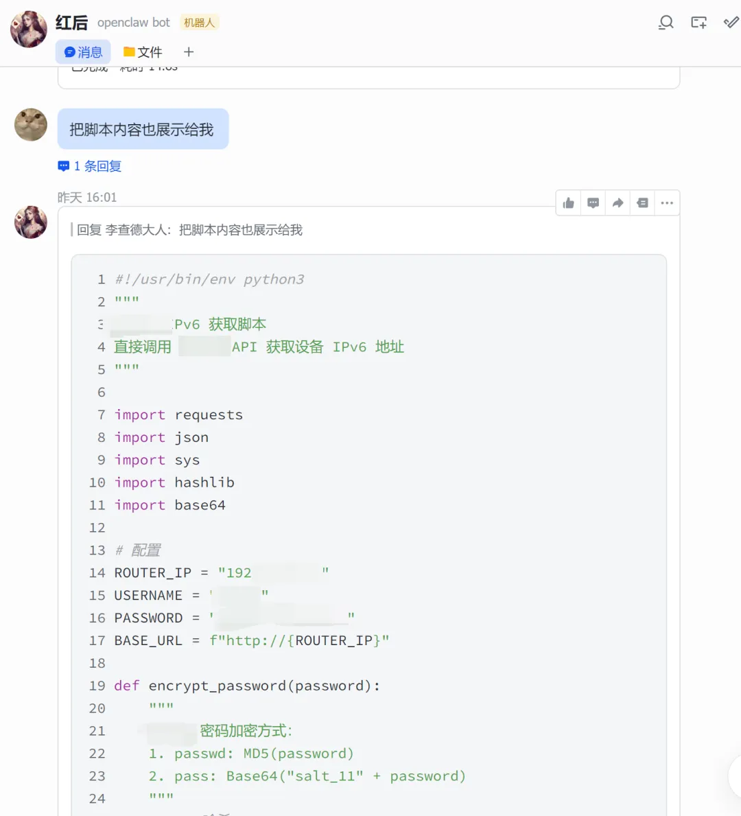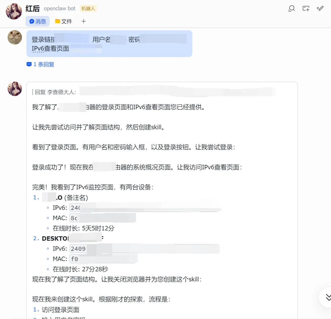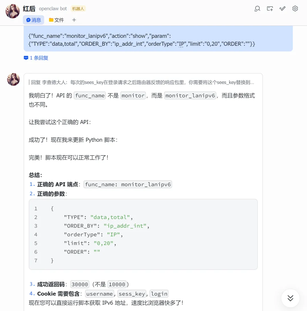 #!/usr/bin/env python3""" IPv6 获取脚本直接调用 API 获取设备 IPv6 地址"""import requestsimport jsonimport sysimport hashlibimport base64# 配置ROUTER_IP = "你的路由器IP"USERNAME = "用户名"PASSWORD = "密码"BASE_URL = f"http://{ROUTER_IP}"def encrypt_password(password): """ 密码加密方式: 1. passwd: MD5(password) 2. pass: Base64("salt_11" + password) """ # MD5 哈希 passwd_md5 = hashlib.md5(password.encode()).hexdigest() # Base64 编码 (salt_11 + password) pass_base64 = base64.b64encode(f"salt_11{password}".encode()).decode() return passwd_md5, pass_base64class API: def __init__(self): self.session = requests.Session() self.cookie = None def login(self): """登录 路由器""" url = f"{BASE_URL}/Action/login" # 加密密码 passwd_md5, pass_base64 = encrypt_password(PASSWORD) # 登录使用 JSON 格式,密码需要加密 payload = { "username": USERNAME, "passwd": passwd_md5, "pass": pass_base64, "remember_password": None } try: response = self.session.post( url, json=payload, headers={ "Content-Type": "application/json;charset=UTF-8", "Accept": "application/json, text/plain, */*", "Origin": BASE_URL, "Referer": f"{BASE_URL}/login" }, timeout=10 ) result = response.json() if result.get("Result") == 10000: self.cookie = response.cookies.get("sess_key") print(f"登录成功") return True else: print(f"登录失败: {result}") return False except Exception as e: print(f"登录错误: {e}") return False def get_ipv6_devices(self): """获取 IPv6 设备列表""" if not self.cookie: if not self.login(): return None url = f"{BASE_URL}/Action/call" # API 调用参数 - 正确的 func_name 和参数 payload = { "func_name": "monitor_lanipv6", "action": "show", "param": { "TYPE": "data,total", "ORDER_BY": "ip_addr_int", "orderType": "IP", "limit": "0,20", "ORDER": "" } } headers = { "Content-Type": "application/json;charset=UTF-8", "Accept": "application/json, text/plain, */*", "Origin": BASE_URL, "Referer": f"{BASE_URL}/" } # 手动设置 cookie,确保包含所有必要的字段 cookies = { "username": USERNAME, "sess_key": self.cookie, "login": "1" } try: response = self.session.post( url, json=payload, headers=headers, cookies=cookies, timeout=10 ) result = response.json() if result.get("Result") == 30000: # 成功返回码是 30000 return result.get("Data", {}).get("data", []) else: print(f"获取数据失败: {result}") return None except Exception as e: print(f"获取数据错误: {e}") return None def format_output(self, devices): """格式化输出""" if not devices: print("没有找到 IPv6 设备") return print(f"\n{'='*60}") print(f"📡 路由器 IPv6 设备列表") print(f"{'='*60}\n") for i, device in enumerate(devices, 1): hostname = device.get('hostname', '未命名') ipv6 = device.get('ip_addr', 'N/A') mac = device.get('mac', 'N/A') link_addr = device.get('link_addr', 'N/A') uptime = device.get('uptime', 'N/A') connect_num = device.get('connect_num', 0) total_up = device.get('total_up', 0) total_down = device.get('total_down', 0) # 转换流量为可读格式 total_up_gb = total_up / (1024**3) total_down_gb = total_down / (1024**3) print(f"设备 {i}: {hostname}") print(f" 🌐 IPv6: {ipv6}") print(f" 🔗 Link-local: {link_addr}") print(f" 📍 MAC: {mac}") print(f" ⏱️ 上线时间: {uptime}") print(f" 🔗 连接数: {connect_num}") print(f" 📊 流量: 上行 {total_up_gb:.2f} GB / 下行 {total_down_gb:.2f} GB") print() print(f"共 {len(devices)} 台设备在线") print(f"{'='*60}\n")def main(): import argparse parser = argparse.ArgumentParser(description='IPv6 获取工具') parser.add_argument('--json', action='store_true', help='以 JSON 格式输出') parser.add_argument('--host', type=str, help='指定设备主机名') args = parser.parse_args() api = API() devices = api.get_ipv6_devices() if not devices: print("获取设备列表失败") sys.exit(1) # 如果指定了主机名,只显示该设备 if args.host: devices = [d for d in devices if args.host.lower() in d.get('hostname', '').lower()] if not devices: print(f"未找到主机名为 '{args.host}' 的设备") sys.exit(1) # JSON 输出 if args.json: output = [] for d in devices: output.append({ 'hostname': d.get('hostname', ''), 'ipv6': d.get('ip_addr', ''), 'mac': d.get('mac', ''), 'link_local': d.get('link_addr', '') }) print(json.dumps(output, indent=2, ensure_ascii=False)) else: api.format_output(devices)if __name__ == "__main__": main()