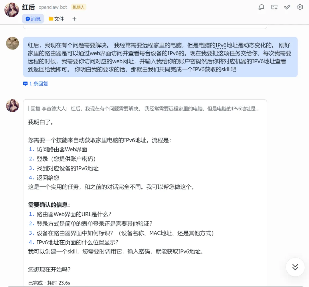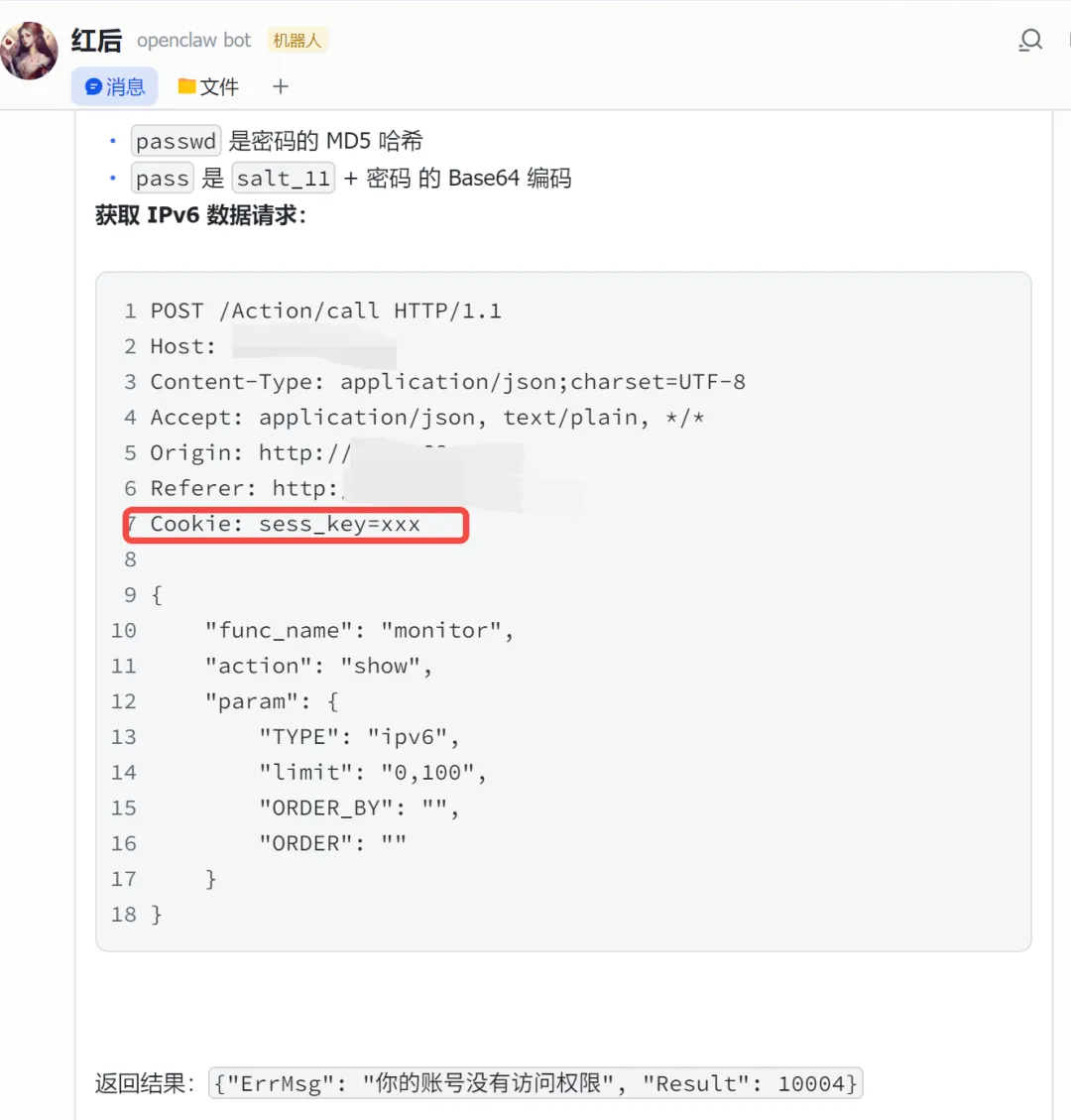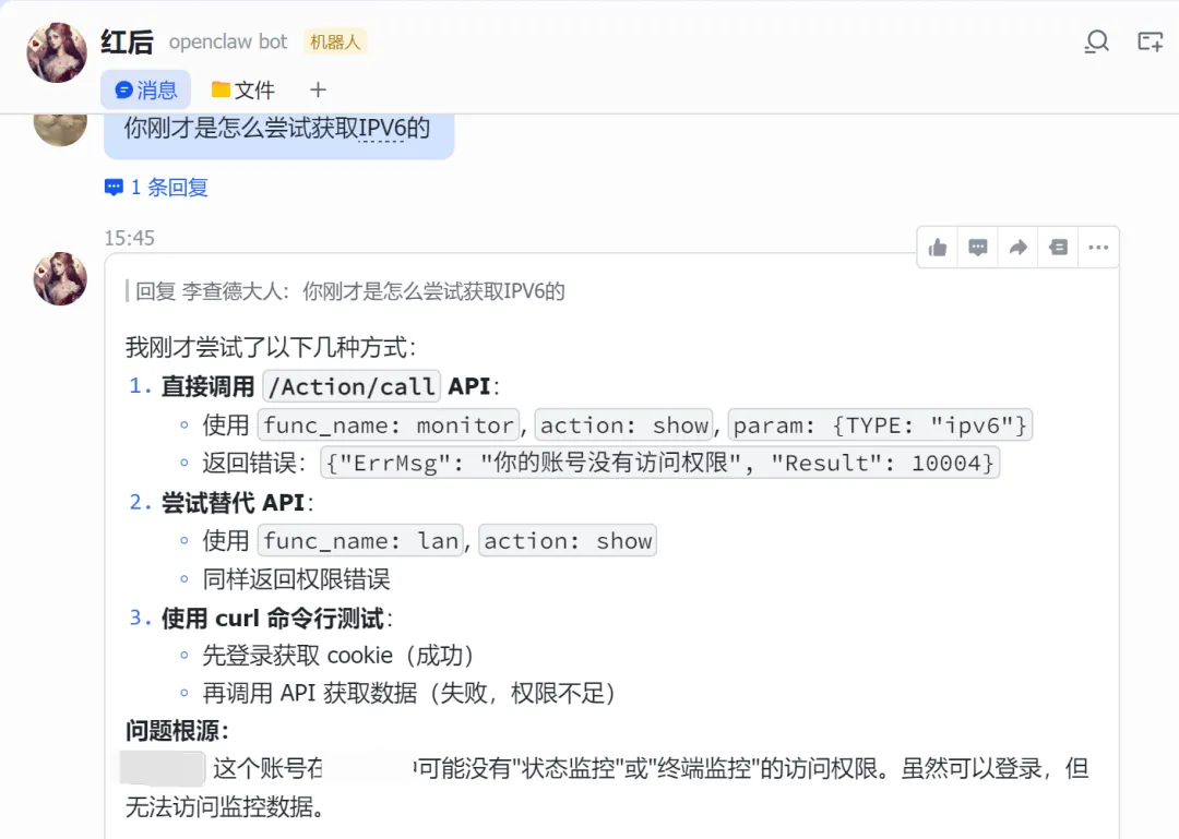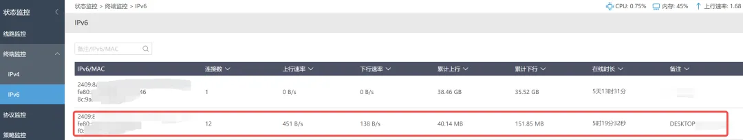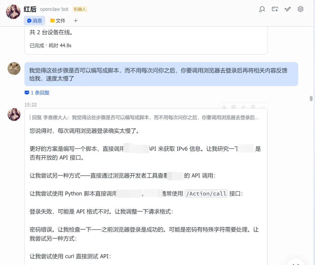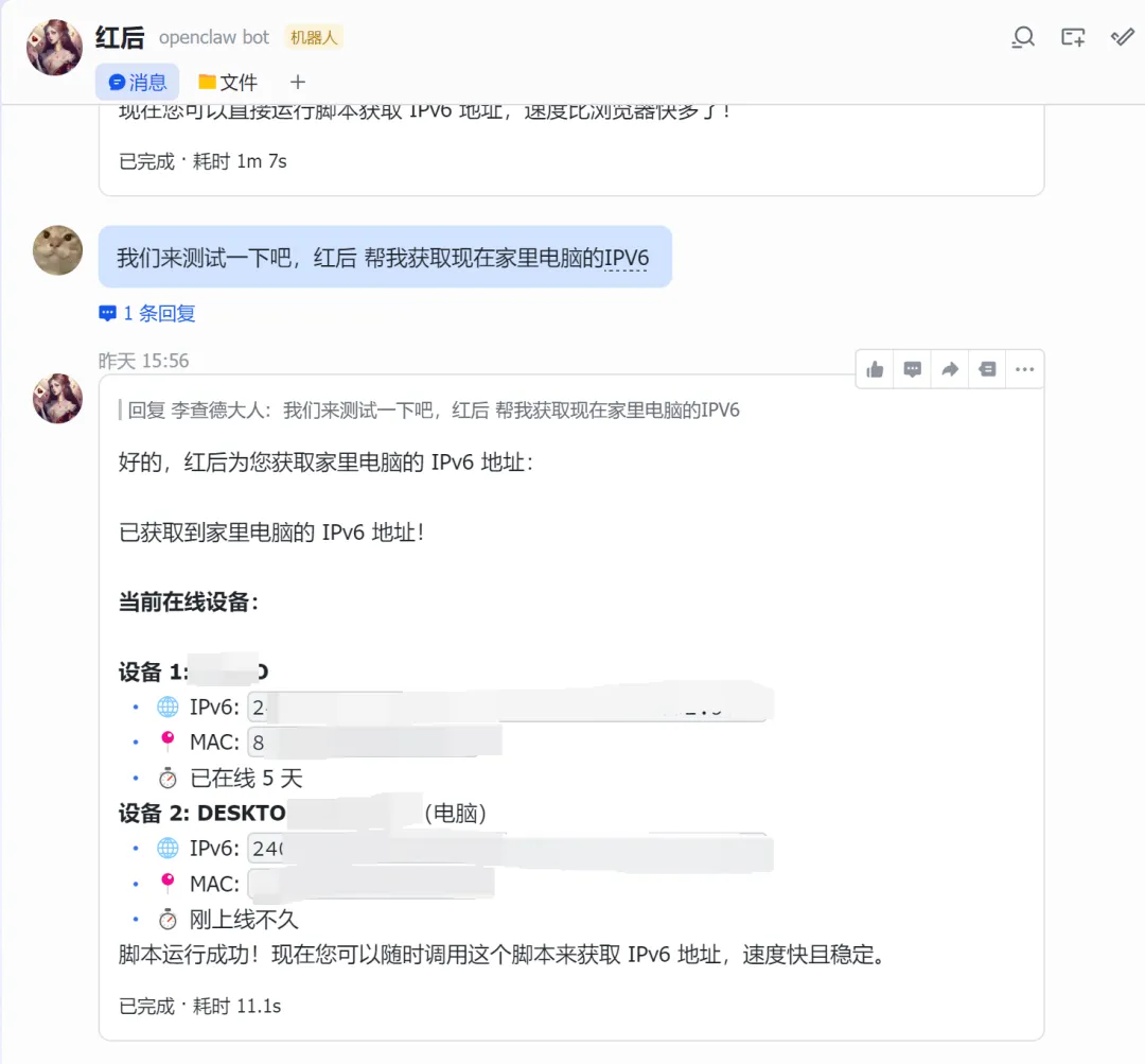 #!/usr/bin/env python3""" IPv6 获取脚本直接调用 API 获取设备 IPv6 地址"""import requestsimport jsonimport sysimport hashlibimport base64# 配置ROUTER_IP = "你的路由器IP"USERNAME = "用户名"PASSWORD = "密码"BASE_URL = f"http://{ROUTER_IP}"def encrypt_password(password): """ 密码加密方式: 1. passwd: MD5(password) 2. pass: Base64("salt_11" + password) """ # MD5 哈希 passwd_md5 = hashlib.md5(password.encode()).hexdigest() # Base64 编码 (salt_11 + password) pass_base64 = base64.b64encode(f"salt_11{password}".encode()).decode() return passwd_md5, pass_base64class API: def __init__(self): self.session = requests.Session() self.cookie = None def login(self): """登录 路由器""" url = f"{BASE_URL}/Action/login" # 加密密码 passwd_md5, pass_base64 = encrypt_password(PASSWORD) # 登录使用 JSON 格式,密码需要加密 payload = { "username": USERNAME, "passwd": passwd_md5, "pass": pass_base64, "remember_password": None } try: response = self.session.post( url, json=payload, headers={ "Content-Type": "application/json;charset=UTF-8", "Accept": "application/json, text/plain, */*", "Origin": BASE_URL, "Referer": f"{BASE_URL}/login" }, timeout=10 ) result = response.json() if result.get("Result") == 10000: self.cookie = response.cookies.get("sess_key") print(f"登录成功") return True else: print(f"登录失败: {result}") return False except Exception as e: print(f"登录错误: {e}") return False def get_ipv6_devices(self): """获取 IPv6 设备列表""" if not self.cookie: if not self.login(): return None url = f"{BASE_URL}/Action/call" # API 调用参数 - 正确的 func_name 和参数 payload = { "func_name": "monitor_lanipv6", "action": "show", "param": { "TYPE": "data,total", "ORDER_BY": "ip_addr_int", "orderType": "IP", "limit": "0,20", "ORDER": "" } } headers = { "Content-Type": "application/json;charset=UTF-8", "Accept": "application/json, text/plain, */*", "Origin": BASE_URL, "Referer": f"{BASE_URL}/" } # 手动设置 cookie,确保包含所有必要的字段 cookies = { "username": USERNAME, "sess_key": self.cookie, "login": "1" } try: response = self.session.post( url, json=payload, headers=headers, cookies=cookies, timeout=10 ) result = response.json() if result.get("Result") == 30000: # 成功返回码是 30000 return result.get("Data", {}).get("data", []) else: print(f"获取数据失败: {result}") return None except Exception as e: print(f"获取数据错误: {e}") return None def format_output(self, devices): """格式化输出""" if not devices: print("没有找到 IPv6 设备") return print(f"\n{'='*60}") print(f"📡 路由器 IPv6 设备列表") print(f"{'='*60}\n") for i, device in enumerate(devices, 1): hostname = device.get('hostname', '未命名') ipv6 = device.get('ip_addr', 'N/A') mac = device.get('mac', 'N/A') link_addr = device.get('link_addr', 'N/A') uptime = device.get('uptime', 'N/A') connect_num = device.get('connect_num', 0) total_up = device.get('total_up', 0) total_down = device.get('total_down', 0) # 转换流量为可读格式 total_up_gb = total_up / (1024**3) total_down_gb = total_down / (1024**3) print(f"设备 {i}: {hostname}") print(f" 🌐 IPv6: {ipv6}") print(f" 🔗 Link-local: {link_addr}") print(f" 📍 MAC: {mac}") print(f" ⏱️ 上线时间: {uptime}") print(f" 🔗 连接数: {connect_num}") print(f" 📊 流量: 上行 {total_up_gb:.2f} GB / 下行 {total_down_gb:.2f} GB") print() print(f"共 {len(devices)} 台设备在线") print(f"{'='*60}\n")def main(): import argparse parser = argparse.ArgumentParser(description='IPv6 获取工具') parser.add_argument('--json', action='store_true', help='以 JSON 格式输出') parser.add_argument('--host', type=str, help='指定设备主机名') args = parser.parse_args() api = API() devices = api.get_ipv6_devices() if not devices: print("获取设备列表失败") sys.exit(1) # 如果指定了主机名,只显示该设备 if args.host: devices = [d for d in devices if args.host.lower() in d.get('hostname', '').lower()] if not devices: print(f"未找到主机名为 '{args.host}' 的设备") sys.exit(1) # JSON 输出 if args.json: output = [] for d in devices: output.append({ 'hostname': d.get('hostname', ''), 'ipv6': d.get('ip_addr', ''), 'mac': d.get('mac', ''), 'link_local': d.get('link_addr', '') }) print(json.dumps(output, indent=2, ensure_ascii=False)) else: api.format_output(devices)if __name__ == "__main__": main()