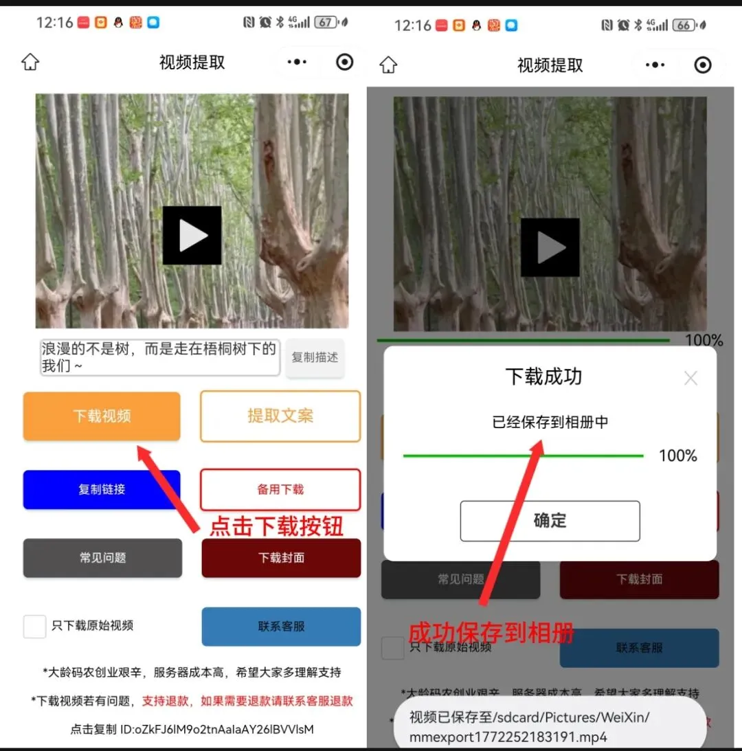 第三步:点击下面画面中的“下载视频”按钮过几秒提示下载成功,视频就会保存到手机相册了