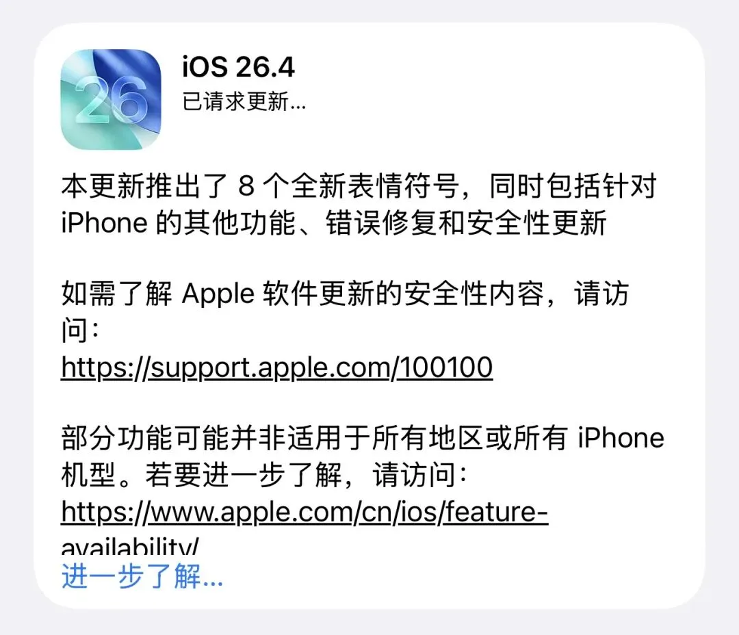 iOS 26.4 正式版(2026-03-24 推送)主打Apple Music AI 功能、辅助体验、安全修复、系统流畅/续航优化,无重磅新功能但细节很实用。
