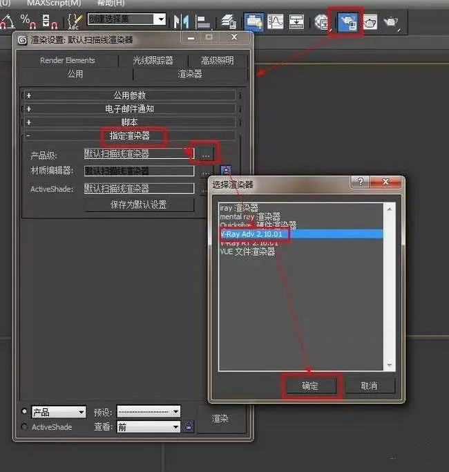 10.检查vray2.0 3dsmax2012 64位中文版是否安装成功,运行3dsmax2012 64中文版,按键盘F10渲染设置-指定渲染-渲染器选择-vray2.0-确定,保存为默认设置即可。