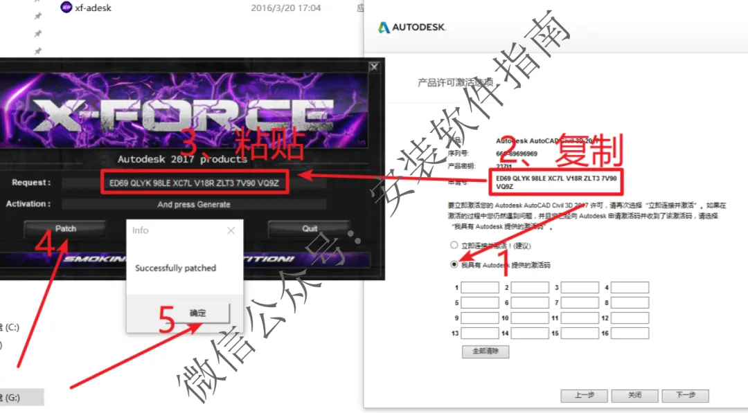 20.点我具有Autodesk提供的激活码,复制步骤2方框中的申请号,把申请号粘贴到步骤3箭头所指的方框内,点Patch,点确定