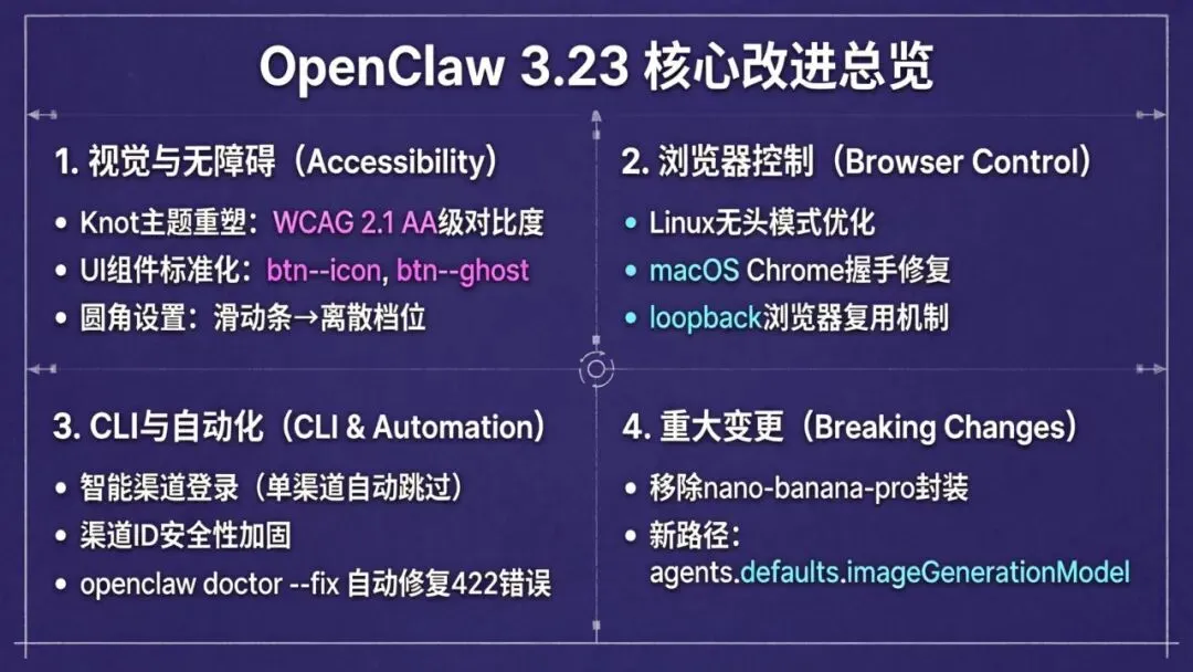 OpenClaw v2026.3.23 是一个专注于系统稳定性与用户体验标准化的更新。本次更新不仅优化了高对比度视觉表现,还彻底解决了 Linux 环境下特定场景的浏览器调用顽疾。