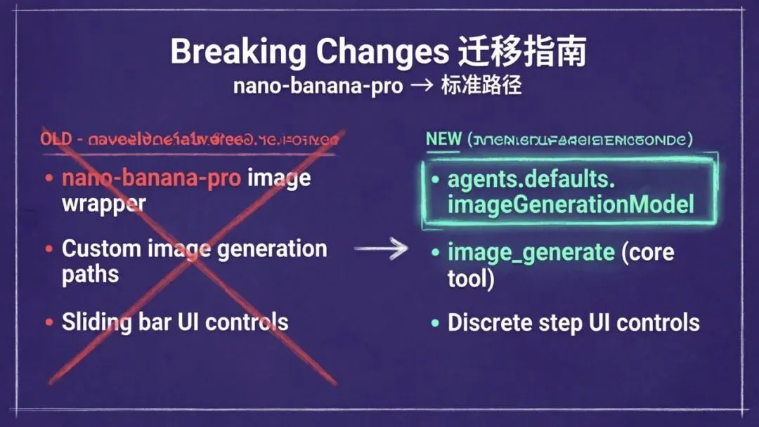 • 图像生成工具迁移:正式移除了旧版的 nano-banana-pro封装。• 路径更新:开发者需将相关脚本指向新的标准路径 agents.defaults.imageGenerationModel。