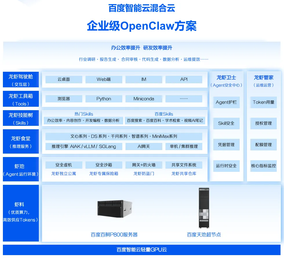 AI的未来,是执行智能的时代,而OpenClaw的规模化落地,是政企解锁AI生产力的关键一步。百度智能云混合云企业级OpenClaw方案,依托百度智能云多年技术沉淀与AI全栈能力,以“快部署、高性能、强安全”为核心,以阶梯式配置、全栈能力体系为支撑,真正解决企业级客户养虾的核心痛点,让政企客户无需再为部署配置、算力不足、安全风险担忧,轻松实现开箱即用的安全养虾新体验。