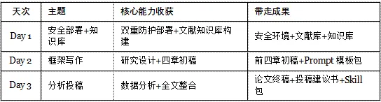 Day 3 产出:数据分析代码框架 + 结果讨论初稿 + 论文终稿 + 投稿建议书 + 个人科研 Skill 包