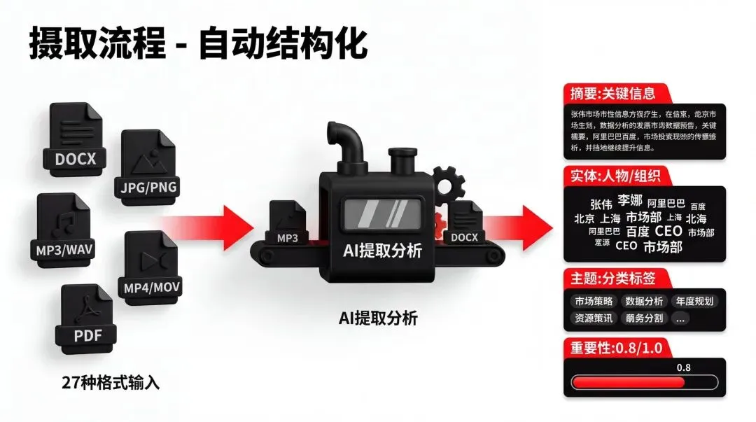 系统会自动提取结构化信息:这段内容的摘要是什么?提到了哪些实体?属于什么主题?重要程度有多高?