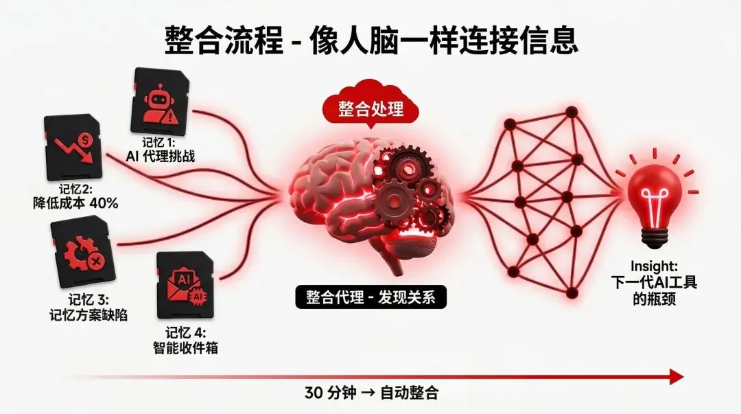 默认每 30 分钟,系统会运行一次“整合”任务。它会把这段时间收集的记忆拿出来,找找它们之间的关系,发现一些你可能没注意到的洞察。