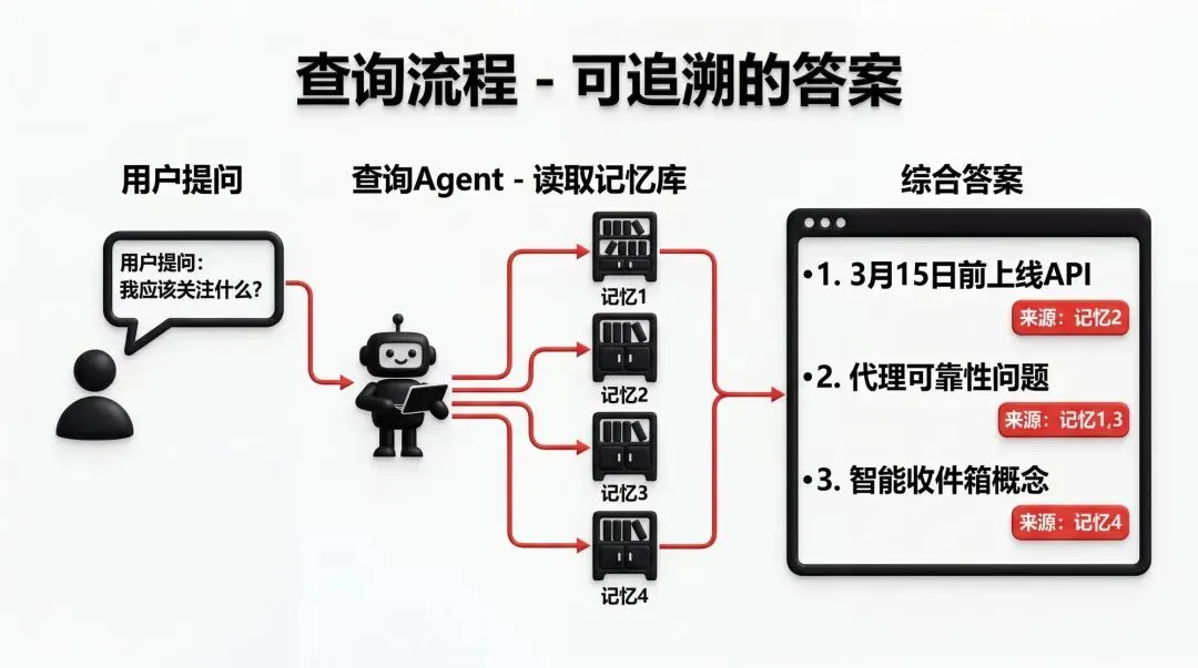 系统会读取所有的记忆和整合洞察,然后综合出一个答案。关键是,每个观点都会标注来源。