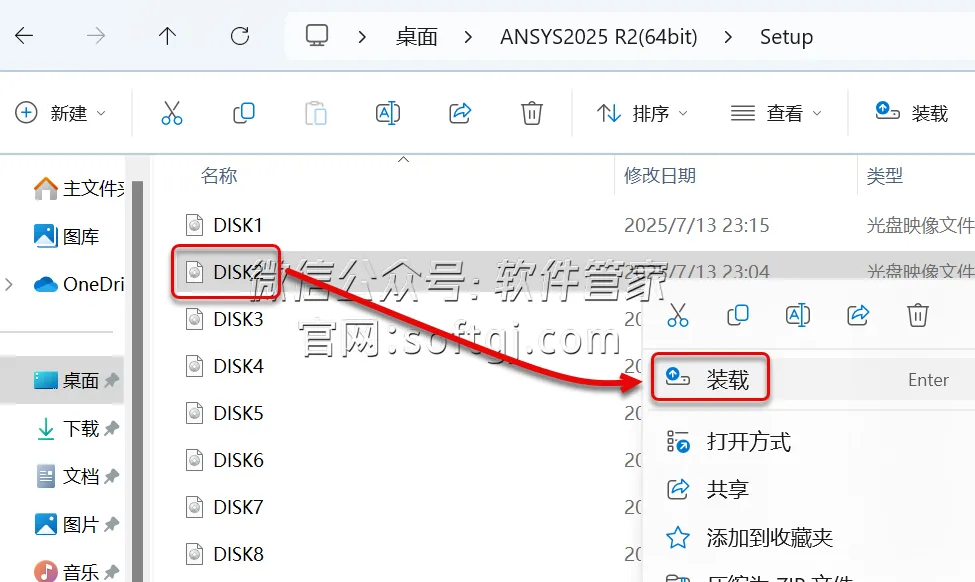41.打开安装包解压后的【ANSYS2025 R2(64bit)】文件夹中【Setup】文件夹,鼠标右击【DISK2】选择【装载】(注意留意装置后的磁盘符,在步骤43将会选择SIDK2装载的磁盘,不同用户这里装置之后磁盘符可能不一致)。