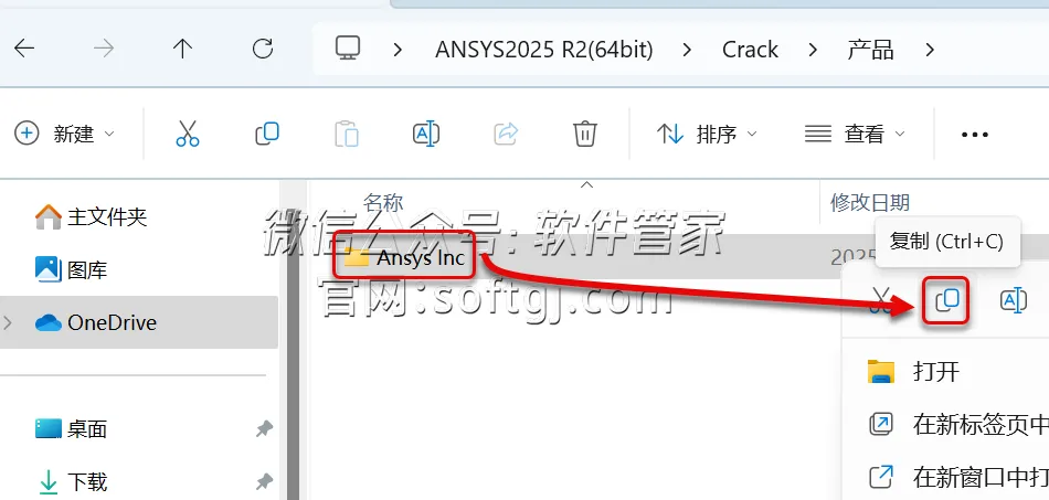 14.打开安装包解压后的【ANSYS2025 R2(64bit)】文件夹,依次打开【Crack\许可】文件夹,鼠标右击【ANSYS Inc】选择【复制】。